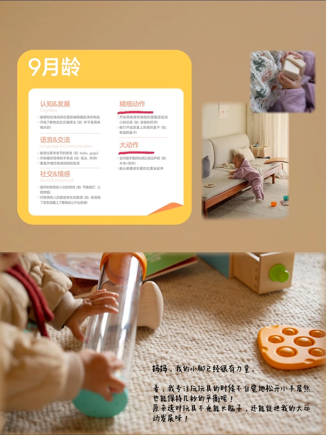 ✅ 从大运动到精细动作,从认知到语言,手册里都安排得明明白白。有了它,我不再担心错过宝宝的发育关键期,也不再被各种早教信息轰炸得焦虑。