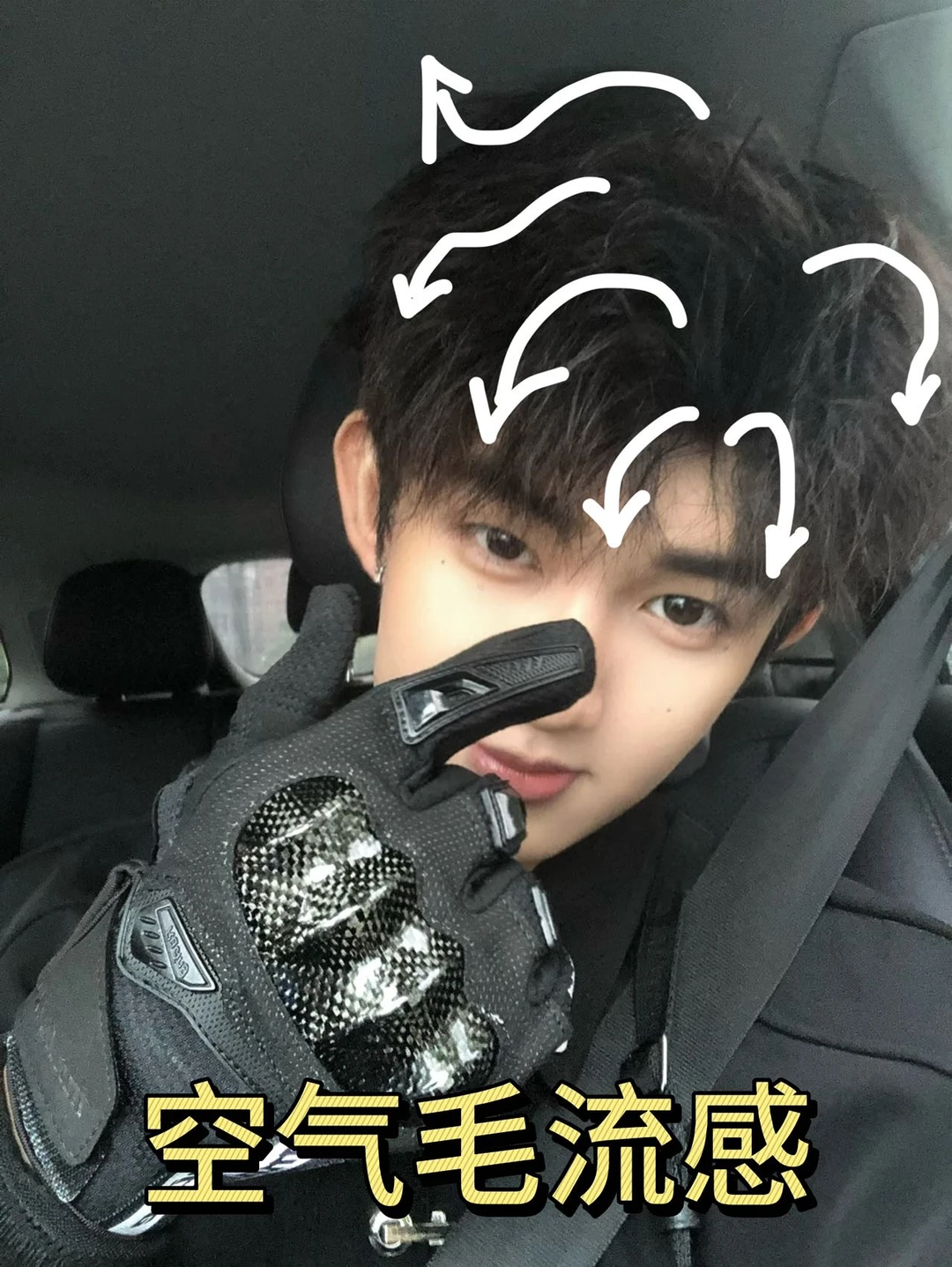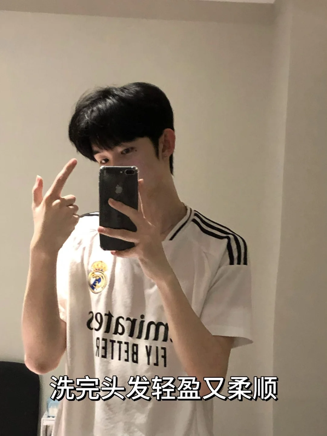 1. 洗后吹到全干,手指分好三七缝,吹风机对着发根往上吹,头顶蓬起来才显少年感,鬓角轻轻压服帖。