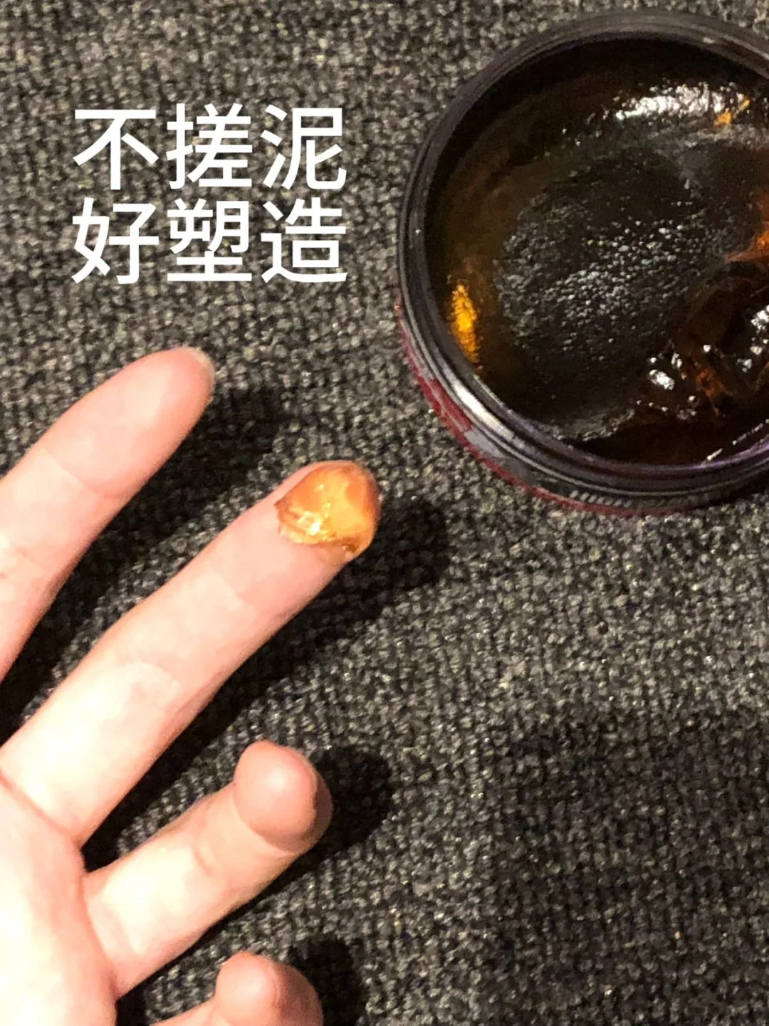 2. 取黄豆大小哑光发油,手心完全搓开、搓到透明,别一坨直接抹头上!从发根往发梢轻抓,顺着分缝往后带,刘海留几缕碎发遮额头,发梢轻轻捏出小束纹理,雾面不油,完全不结块、不泛白。