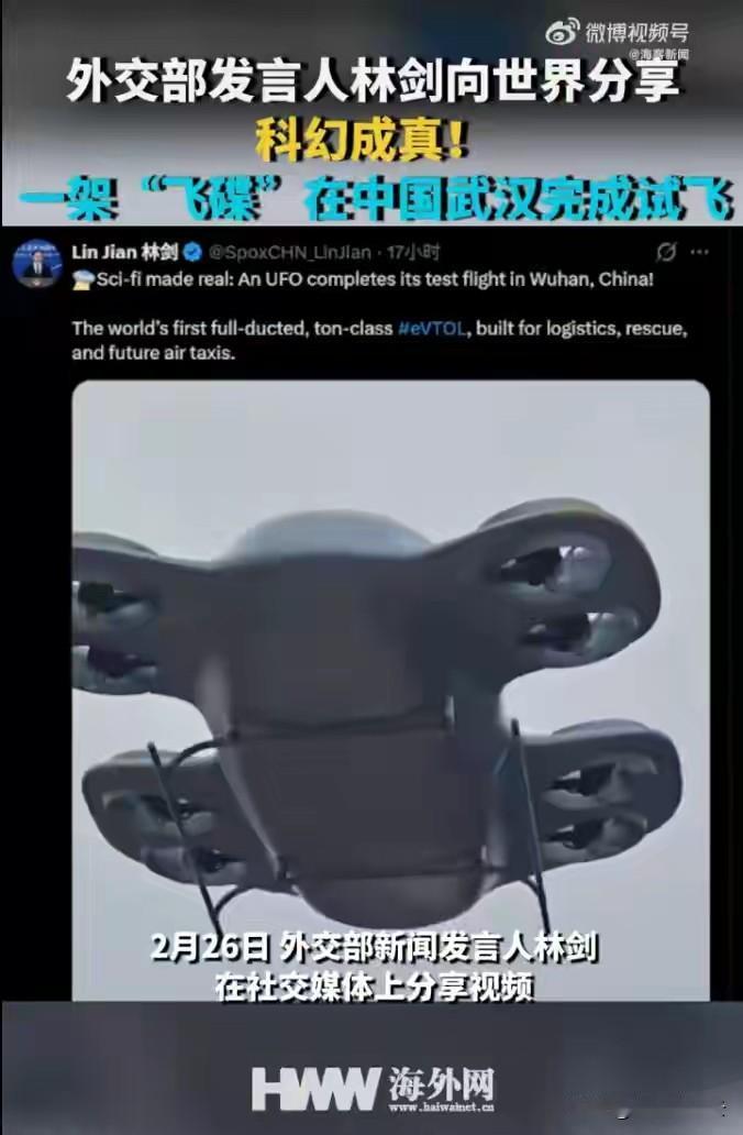 科幻成真!武汉“飞碟”试飞成功! 2月26日,外交部新闻发言人林剑在海外社交媒体重磅分享视频,一句**“科幻成真!一架‘飞碟’在中国武汉完成试飞”**,瞬间点燃全网热议!电影里的UFO不再是想象,它从荧幕飞向现实,稳稳降落在武汉的天空! 这架刷屏全球的“飞碟”,正是全球首创全涵道式吨级电动垂直起降飞行器(eVTOL)“电鹰飞车”,由武汉光谷企业历时6年自主研发、硬核原创。它没有外露旋翼,8组动力桨叶全隐藏在机身涵道里,自带“隐形翅膀”,彻底告别传统飞行器的安全隐患,能贴着楼宇、穿梭街巷,在城市高密度空间里灵活飞行,3秒垂直起飞、平稳悬停、精准降落,每一个动作都丝滑又震撼。 别看它长得科幻,实力更硬核:最大起飞重量1.2吨,有效载重450公斤,可搭载4人,仅需4个停车位就能起降,纯电驱动静音飞行,充电2小时续航可达150公里,未来时速最高80公里,还配备多重安全保障与智能避障系统,把安全与实用拉满。按照规划,2026年它将率先投入物流运输、空中救援,打通山区配送、应急抢险的“空中生命线”;2027年逐步拓展载人场景,不久的将来,我们打开手机APP就能预约“空中飞的”,告别地面拥堵,实现真正的立体出行! 从实验室到试飞场,从武汉上空到全球视野,这架“飞碟”不仅是中国低空经济的里程碑,更是中国科技自立自强的生动注脚。外交部发言人的海外分享,让世界看见中国创新的速度与温度,也让“中国智造”再次惊艳全球!曾经遥不可及的科幻场景,如今正在中国大地上一一落地;曾经只存在于想象的未来出行,已经从武汉启航,驶向千家万户。