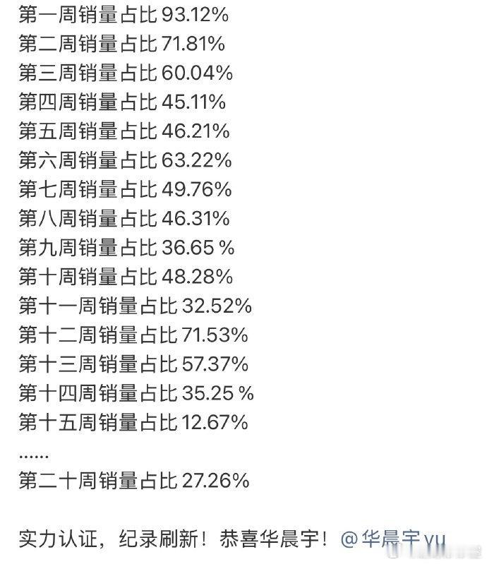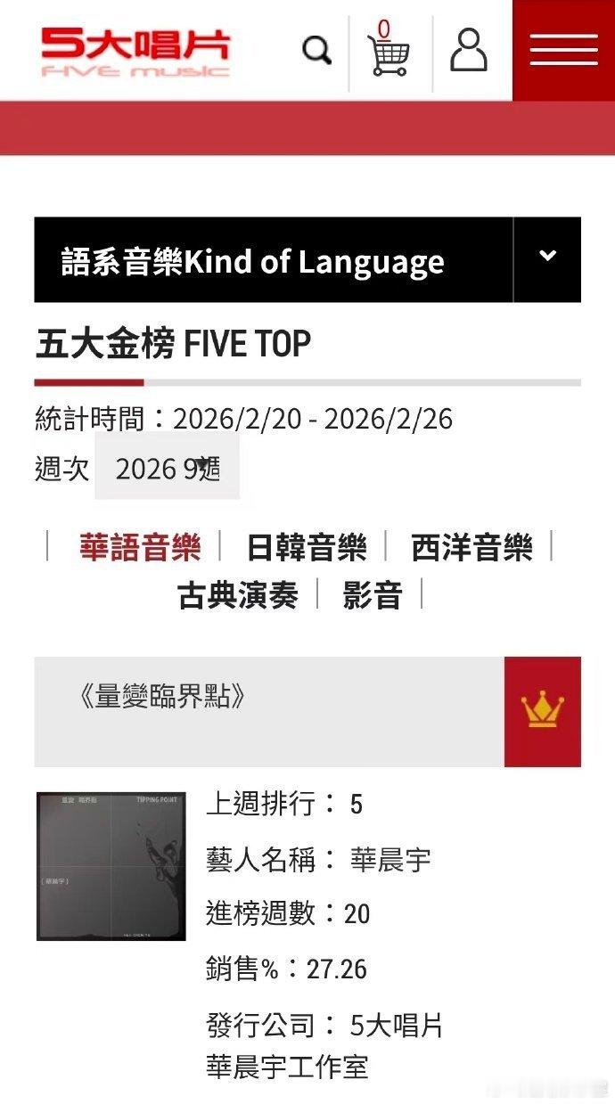 华晨宇第六张个人原创专辑《量变临界点》CD版持续在榜二十周,本周再次登顶五大周榜,拿下专辑第十六个五大周冠,周销量占比27.26%,火星姐哥们真的很长情吧