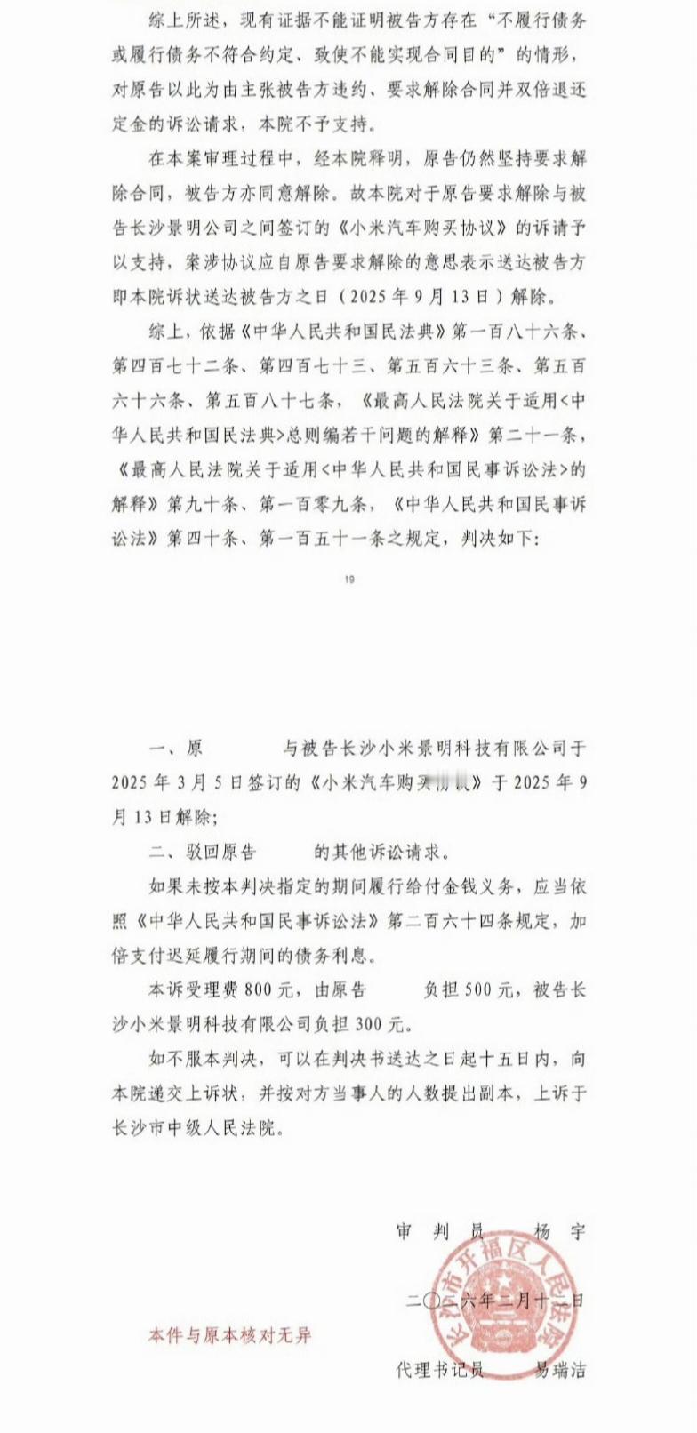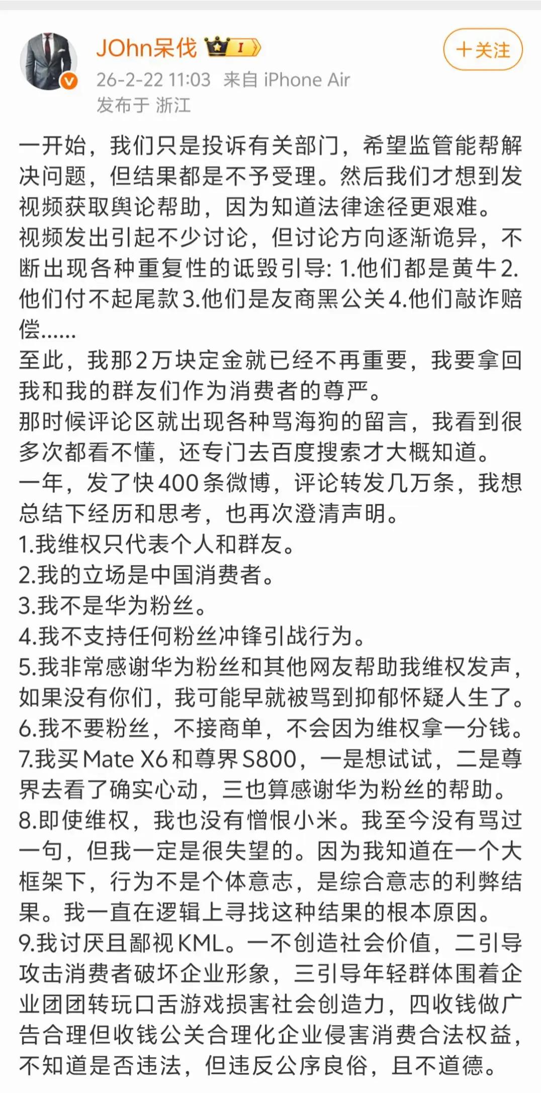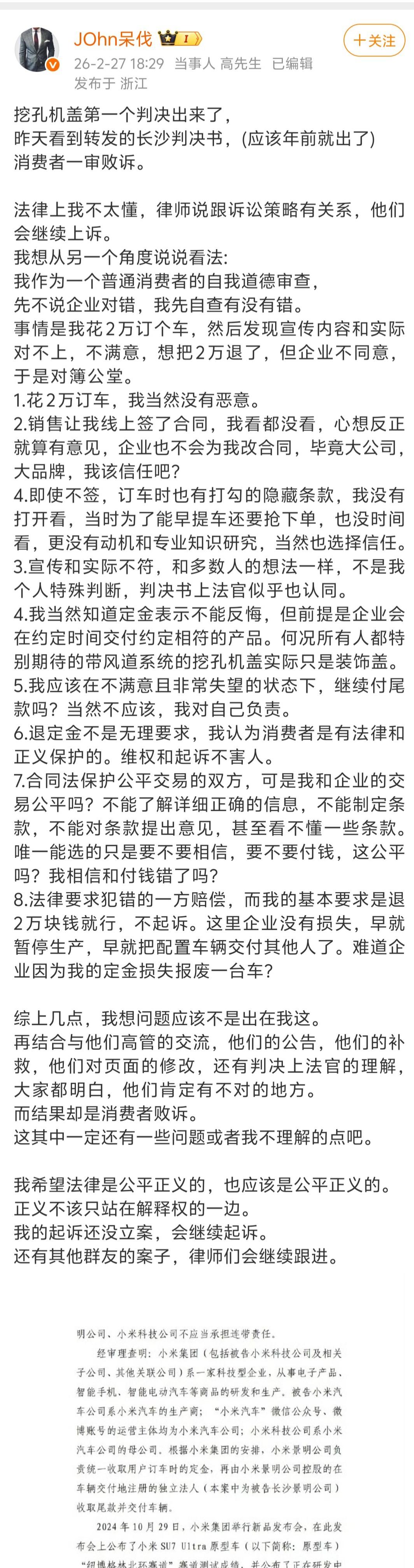 博主“JOhn呆伐”第一时间转发了挖孔机盖的第一个判决书,他说长沙法院的这份判决书年前就出了,消费者一审败诉。 “JOhn呆伐”还发了长长的一篇博文来反思自己,他以普通消费者的身份自查,认为自己订车无恶意,因信任品牌未细看线上合同及隐藏条款,且机盖宣传与实际不符是普遍认知,法官亦对此有认同。但是,长沙市开福区人民法院一审判决是:虚假宣传不成立;定金不予退还;厂商不承担连带责任。 反正我只看懂一点,意思是合同里没有写所以不构成虚假宣传。 “JOhn呆伐”这回搞得都要怀疑人生了,因为,之前他也起诉了,但直到目前他的起诉还没获得法院立案。参考长沙的这个判决,我觉得他败诉的可能性也很大。 综合这个一审的结果,算上定金、诉讼费和律师费,原告消费者的直接经济损失应该不下3万元,隐性的时间与机会成本的损失就各人不同了。