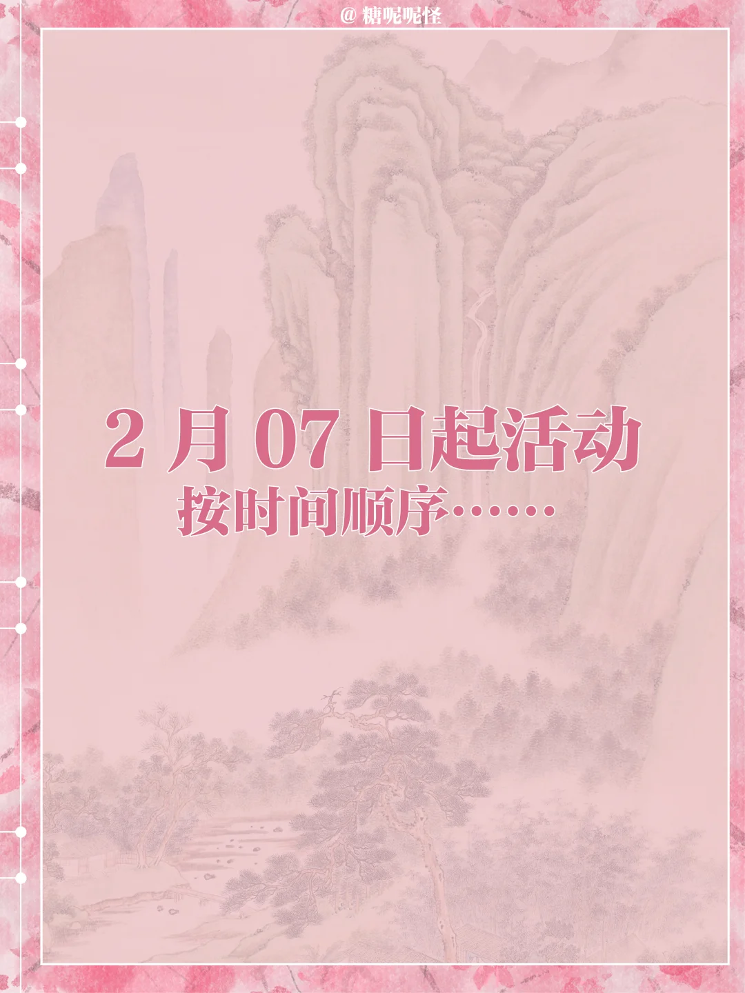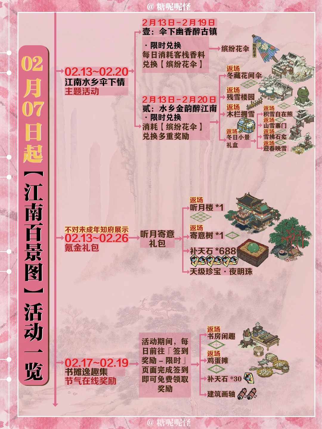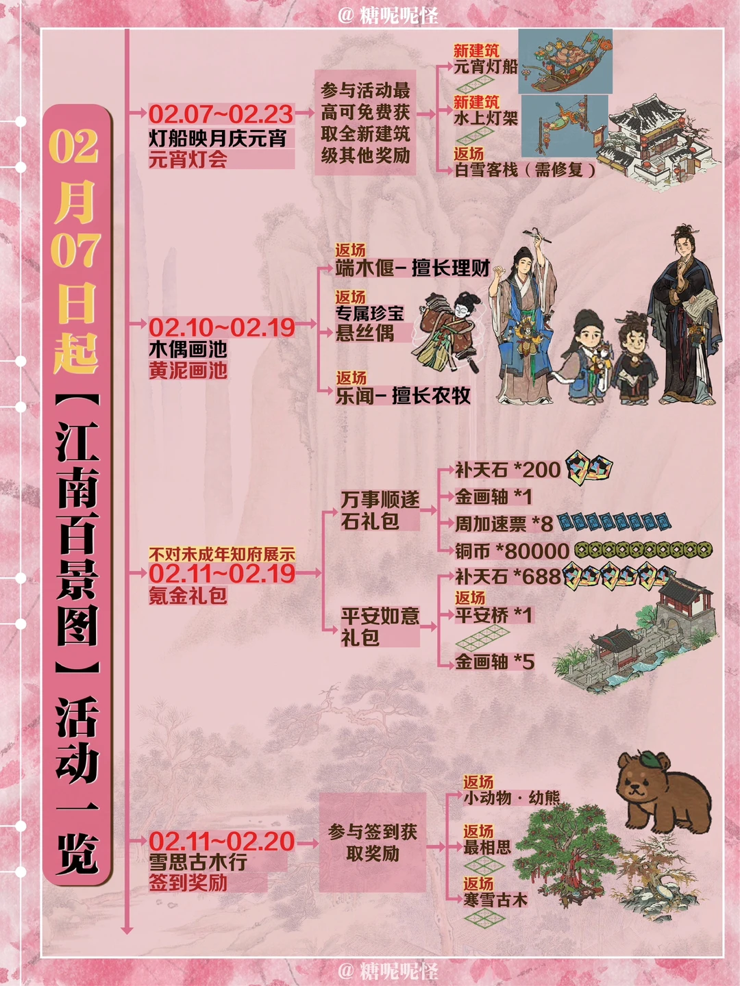 新建筑:【元宵灯船】【水上灯架】 返场人物:【端木偃】【乐闻】 返场动物:【幼熊】 返场建筑:【白雪客栈】【平安桥】【听月楼】【冬藏花间伞】【残雪楼园】【最相思】【寒雪枯木】【寄意树】