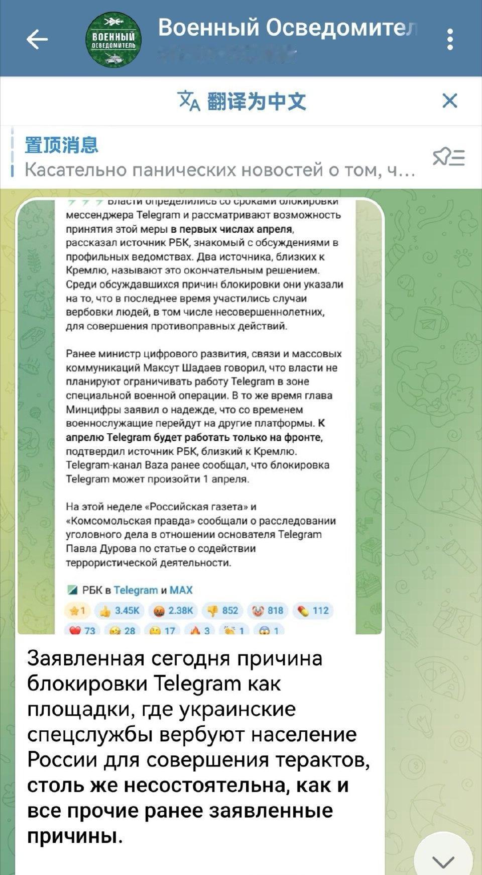 两名接近克里姆林宫的消息人士向RBC(俄罗斯商业咨询控股集团)透露称,俄罗斯当局最终决定在4月初封禁Telegram。主要原因包括招募未成年人参与非法活动的情况增多。在特别军事行动区内的Telegram仍可正常使用。 俄罗斯数字化发展、通信和大众传媒部部长马克苏特·沙达耶夫指出,未来将建议俄罗斯军方转用其他平台。此前,Telegram频道Baza报道称封禁可能于4月1日启动。 俄罗斯军事“军事情报员”在谈到俄罗斯政府将要封禁Telegram的问题时,认为要阻止俄罗斯民众通过互联网被远程招募并参与恐怖袭击,要么就彻底铲除招募行为的根源,要么就直接切断互联网。