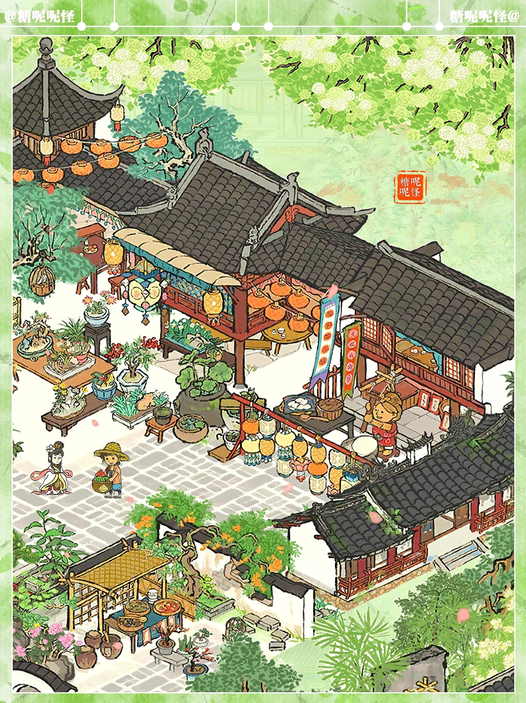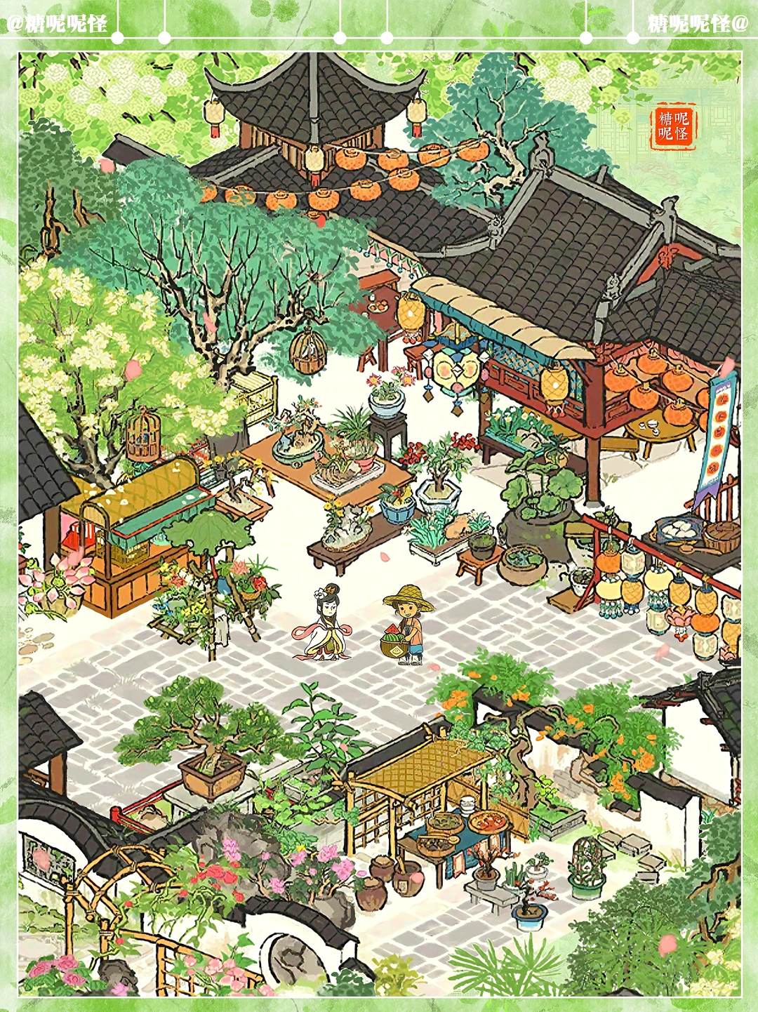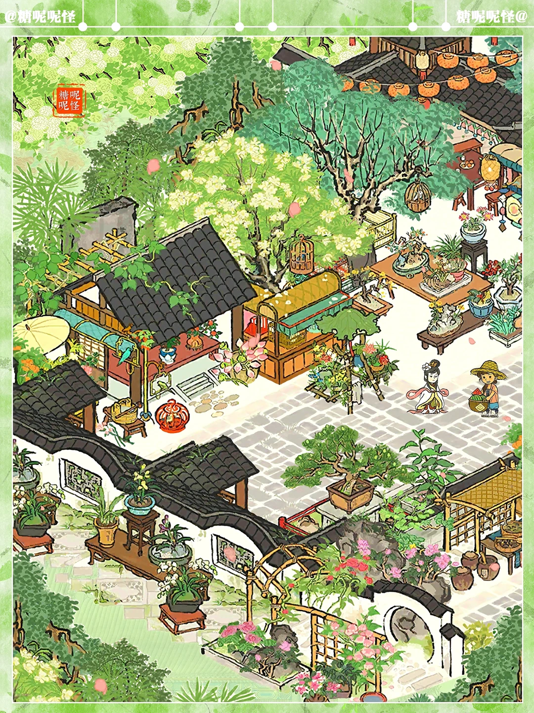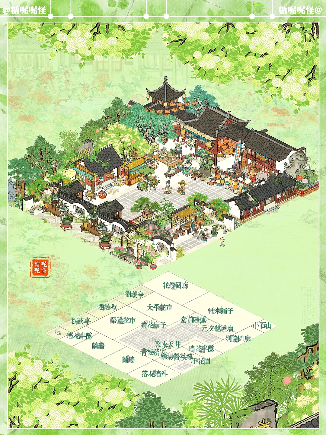 🌸建筑:兰墙|语莺花市|太平花市|糯米铺子|花灯回廊|别院门廊|树荫亭|墙花半隐|落花墙外|维扬酱菜摊|