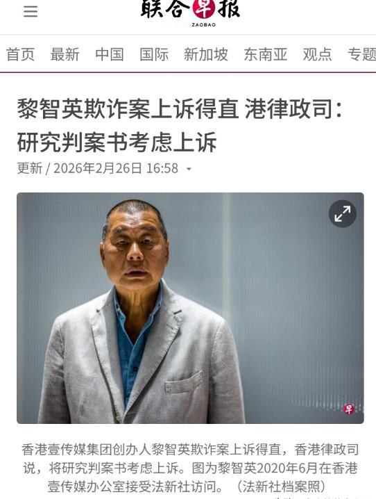黎智英“上诉得直”定罪刑期被撤销,港府不服:接着告! 最近香港司法圈出了个大消息,黎智英的科技园欺诈案上诉有了结果——上诉庭裁定他上诉得直,之前判的5年9个月监禁、200万罚款还有8年取消董事资格的处罚,全被撤销了。 消息一出来,不少别有用心的外媒就开始乱带节奏,说这是“香港法治松动”,甚至扯到什么“政治让步”,纯属睁眼说瞎话。 黎智英这次被撤销定罪,跟他有没有违规没关系,纯粹是法律技术层面的裁决。简单说,法院没否认他长期占用公共资源的事实,只是觉得现有证据下,他的行为没达到刑事欺诈的法定标准。 这事得从1998年说起,黎智英当时租了香港科技园将军澳工业邨的苹果大楼,租契明确约定了用途,结果他没跟科技园申报,也没公示,偷偷让自己私人持有的力高顾问公司入驻,长期占用这块享受低租金优惠的公共土地干私活。 这一占就是22年,直到2022年10月,区域法院审理后裁定他两项欺诈罪成立,判了重刑。当时原审法官就明确说,这是有计划、有组织的长期欺诈,黎智英就是借传媒机构当掩护,规避租契监管。 之后黎智英不服,提起上诉。上诉庭审理后认为,案件的争议点出在租契条文的细节上,按照“疑点利益归于被告”的原则,现有证据不足以认定他构成刑事欺诈,于是撤销了原审的定罪和刑期。 重点来了,撤销定罪不代表黎智英没做错。上诉庭也明确,他违反租契约定、占用公共资源的事实是铁证如山的,只是从刑事法律层面,没达到定罪标准而已。 所以别听外媒瞎忽悠,这不是什么“胜诉”,只是法律程序上的技术性结果,改变不了他公器私用、滥用公共资源的本质。 面对这个结果,香港特区政府的态度很明确——不服,接着告。律政司已经表态,会深入研究上诉庭的判词,保留进一步上诉的权利,绝不会因为这次技术性裁决,就让违规行为不了了之。 还有个关键信息必须说透,黎智英这次的欺诈案上诉结果,跟他的国安法案完全没关系。早在2月9日,他就因为串谋勾结外国势力、串谋发布煽动刊物,违反香港国安法被判了20年监禁,这个判决是依法生效的,一点都不会受影响。 也就是说,就算这次欺诈案的定罪被撤销,黎智英照样得在监狱里服刑,减去之前被羁押的时间,他至少还得再坐18年牢,余生基本都要在高墙内度过。 有人可能会问,港府为什么非要接着告?其实道理很简单,香港是法治社会,法律面前人人平等,不管是谁,只要违反法律、损害公共利益,就必须受到追究。 黎智英长期占用公共资源,损害的是全体香港市民的利益,就算这次没达到刑事定罪标准,港府也得通过合法程序,追究他的违规责任,不能让他钻了法律的空子。 还有些西方势力,借着这事炒作“新闻自由”,纯属混淆视听。这起案件就是简单的租契违规和欺诈争议,跟新闻自由半毛钱关系都没有。 新闻自由从来不是违法的挡箭牌,就算是传媒从业者,也得遵守法律,不能借着“新闻自由”的名义,滥用公共资源、危害社会公共利益。 说到底,港府坚持上诉,不仅是为了追究黎智英的责任,更是为了维护香港的法治公正,守护全体市民的公共利益。 香港的司法始终保持独立,审理案件只看证据和法律条文,不受任何外部舆论和政治势力的干扰。这次的裁决,恰恰体现了香港司法的严谨,既保障了当事人的上诉权利,也没有忽视公共利益的维护。