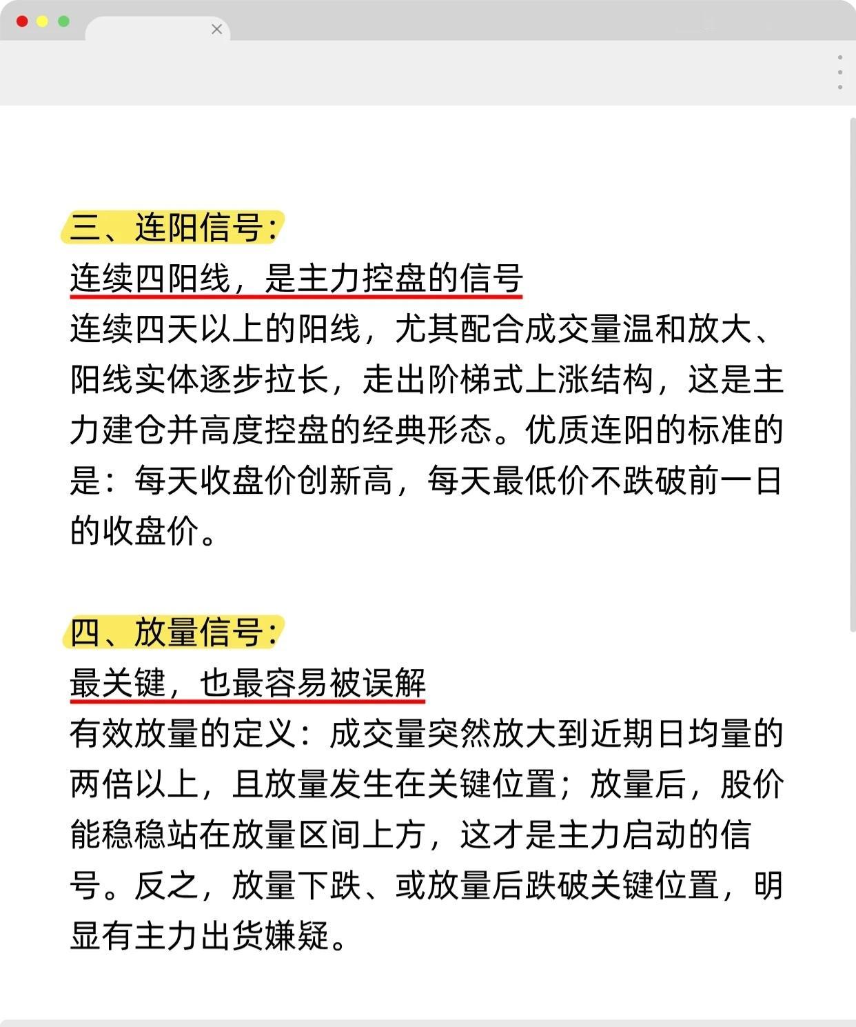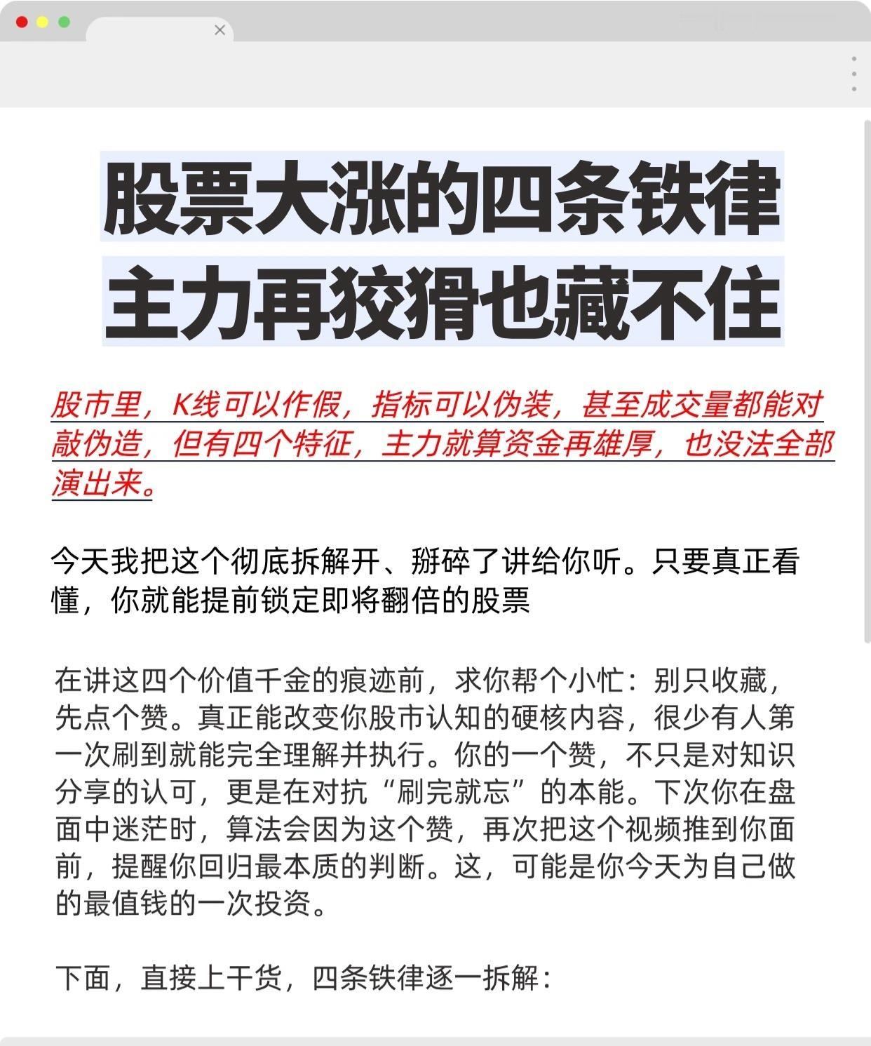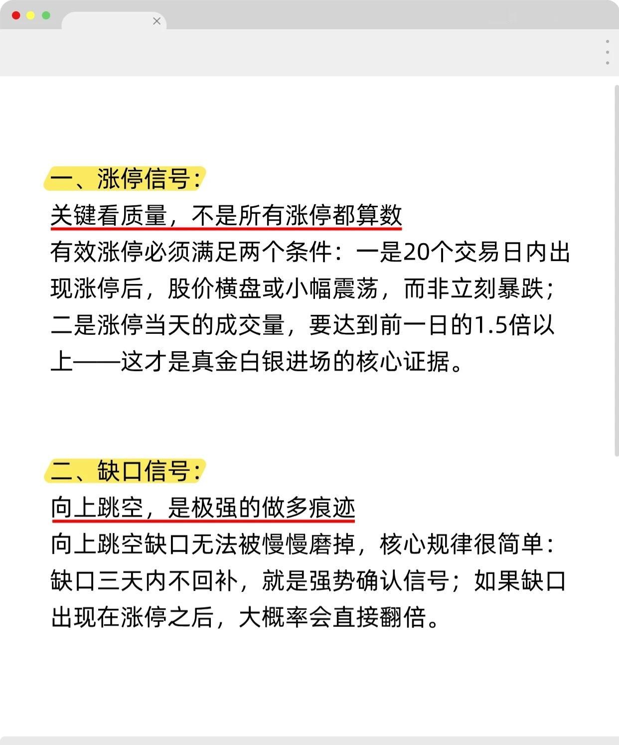 以下总结了股票大涨的四个关键信号及综合判断方法: 1. 涨停信号:20日内涨停后横盘或小幅震荡,且当日成交量≥前日1.5倍。 2. 缺口信号:向上跳空且三天内不回补,涨停后出现则翻倍概率大。 3. 连阳信号:连续四天及以上阳线,收盘创新高、最低价不破前日收盘,量能温和放大。 4. 放量信号:成交量突增至近期日均量两倍以上,出现在关键位且股价站稳放量区。 终极策略:四项信号共振时,主力已进场,主升浪启动,为重仓买入时机。核心是追踪主力真金白银痕迹,而非单纯看K线。