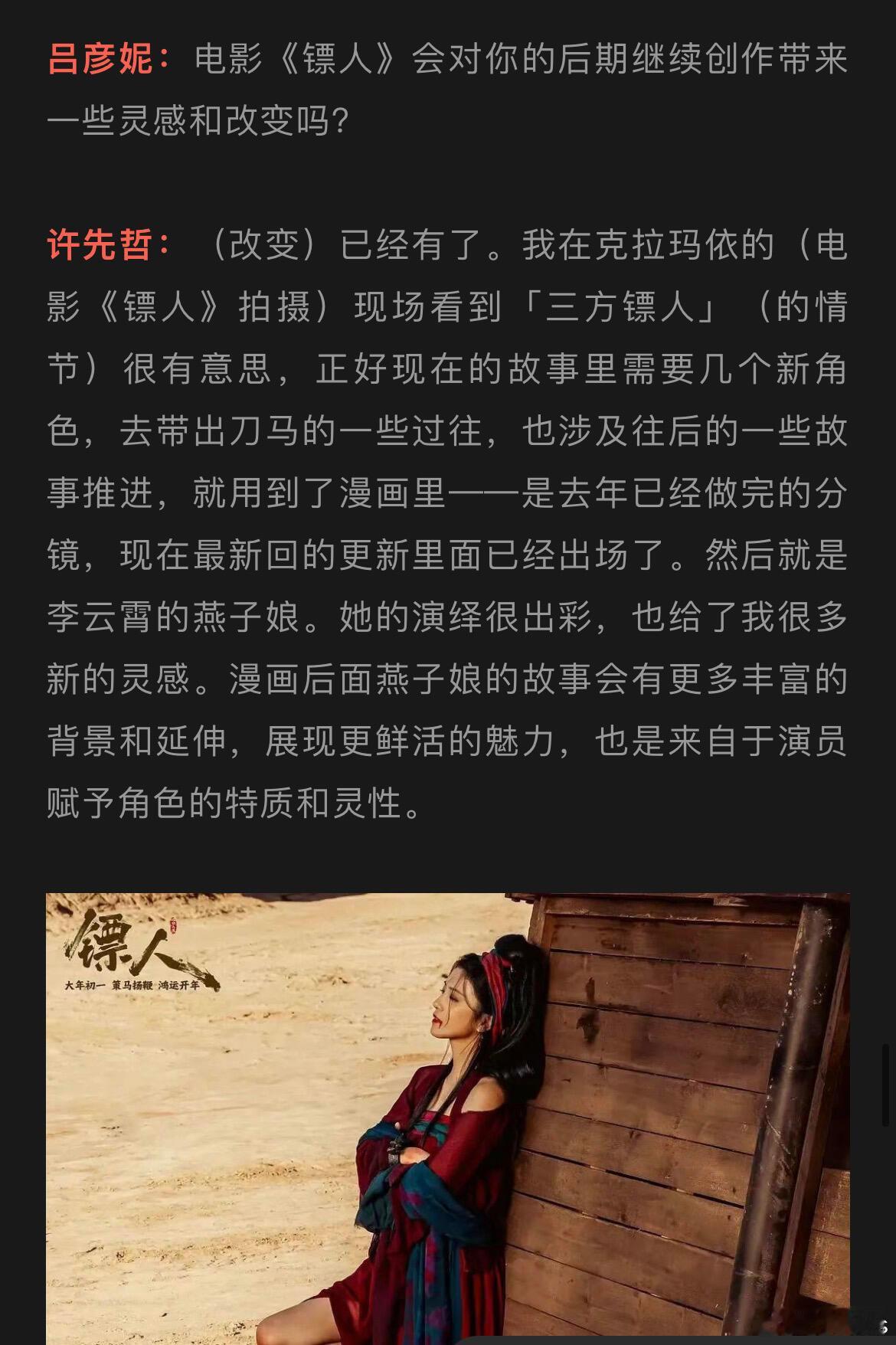 《镖人》漫画作者许先哲:李云霄的燕子娘。她的演绎很出彩,也给了我很多新的灵感。漫画后面燕子娘的故事会有更多丰富的背景和延伸,展现更鲜活的魅力,也是来自于演员赋予角色的特质和灵性