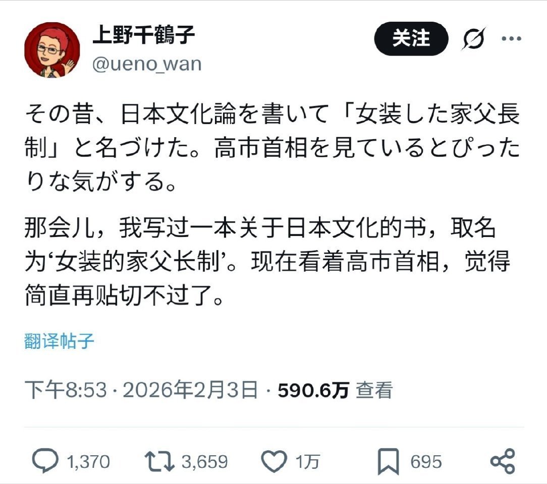 你们日本人是不是太疯了,上野和高市不很明显是不同日本女性观点内部矛盾吗,上野也不是不爱她那日本。