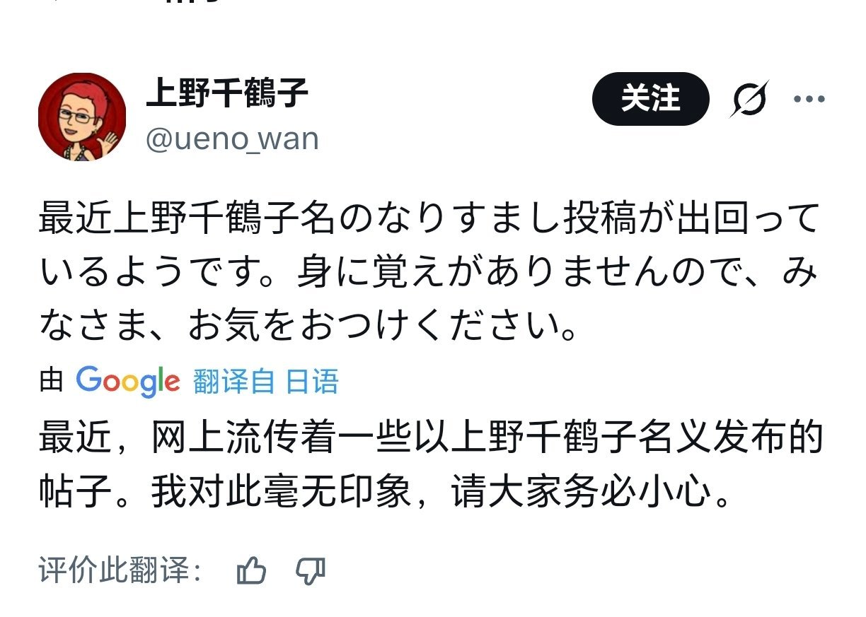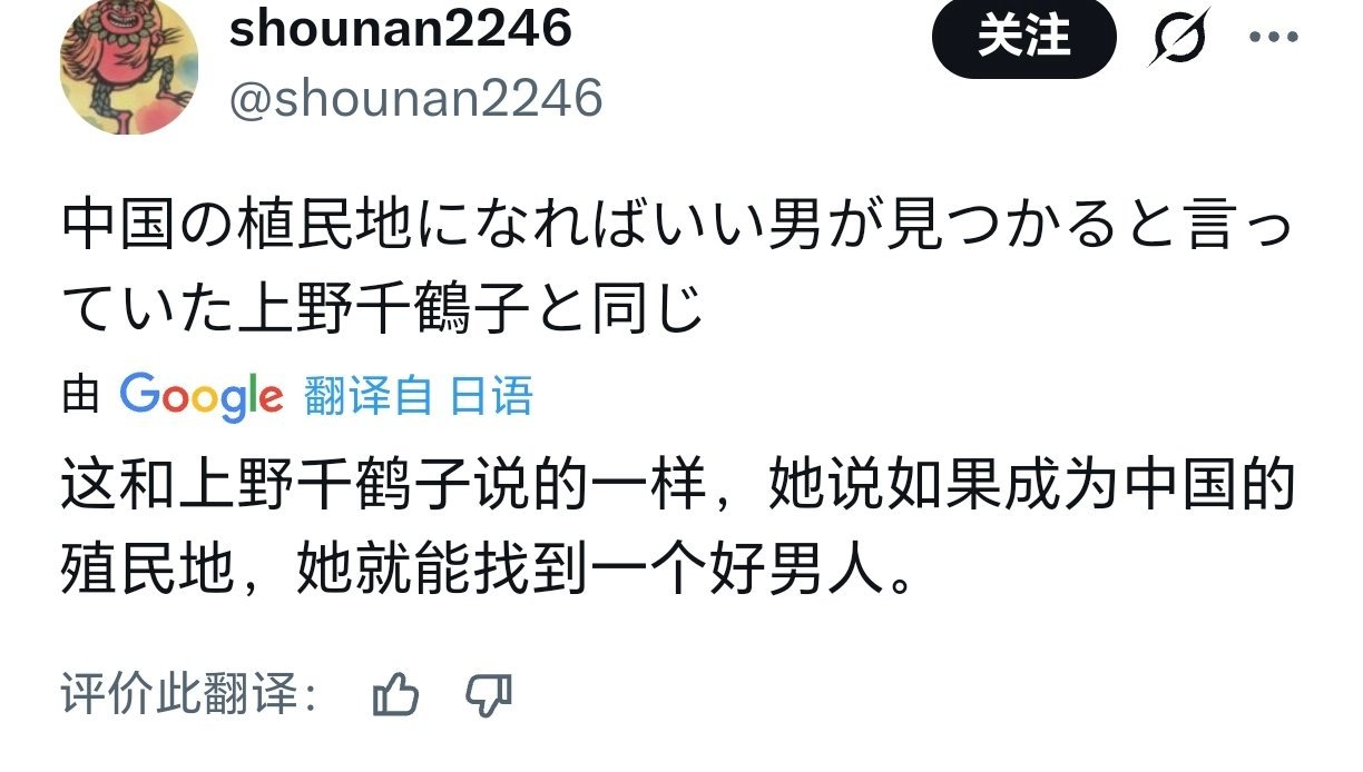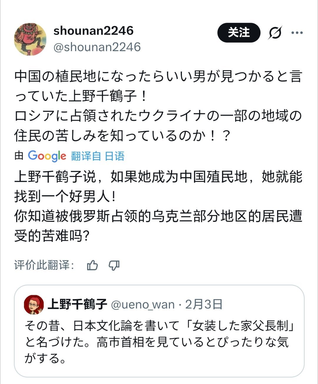 上野千鹤子反对高市早苗,认为高市早苗是男权伥鬼↓高市早苗粉丝造谣上野千鹤子发表“我希望日本成为中国殖民地”言论↓上野千鹤子辟谣↓但还是有人想把上野千鹤子“送给中国”
