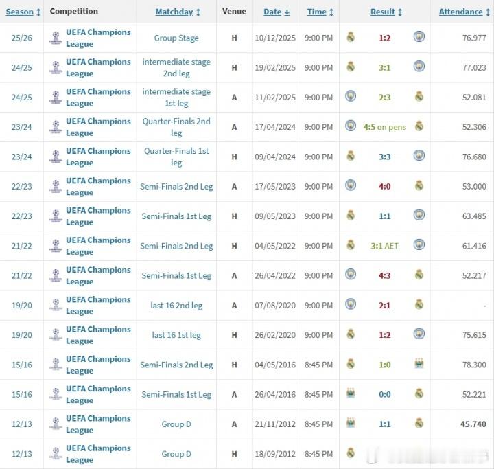 年年见曼城和皇马连续第5个赛季在淘汰赛中交手,本赛季1/8决赛再次碰面,也意味着两队在6年内将交锋13次!皇马vs曼城