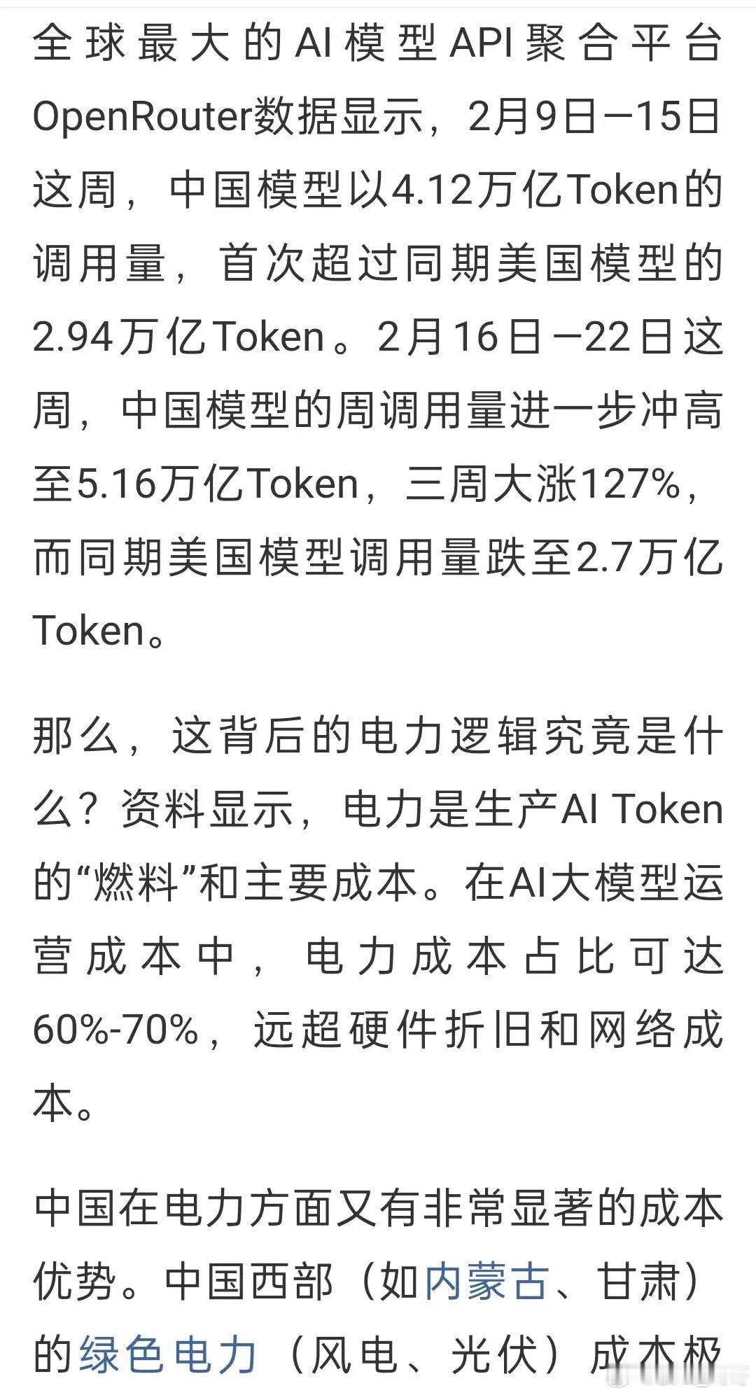根据媒体报道,2月9号到15号这一周,中国大模型token调用量达到4.12万亿次,超过了同期美国的2.94万亿次,到2月16到22号这周,中国大模型token调用量增加到5.12万亿次,比美国同期的2.7万亿次高的更多了。