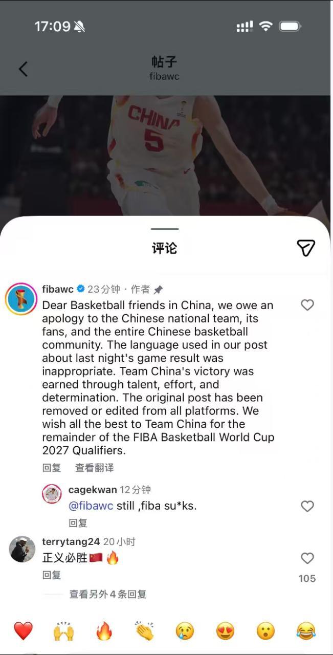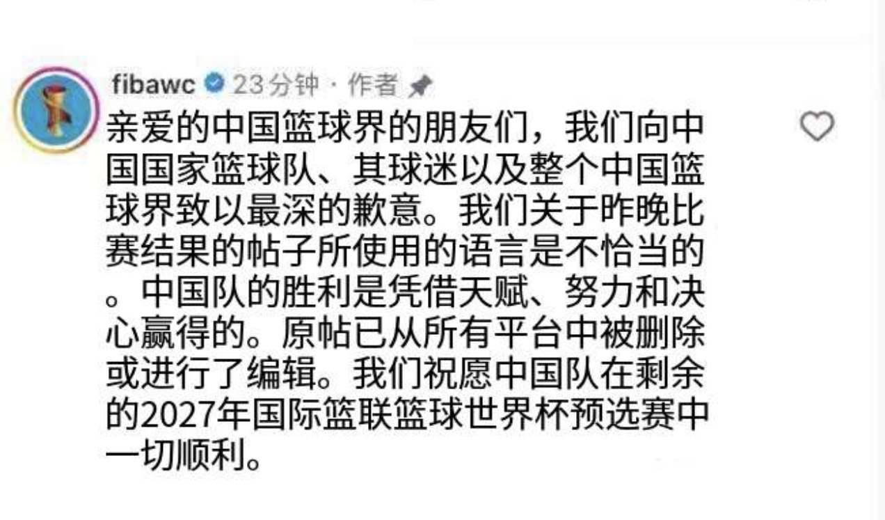 哦哦,fiba在原帖评论区做了致歉~~