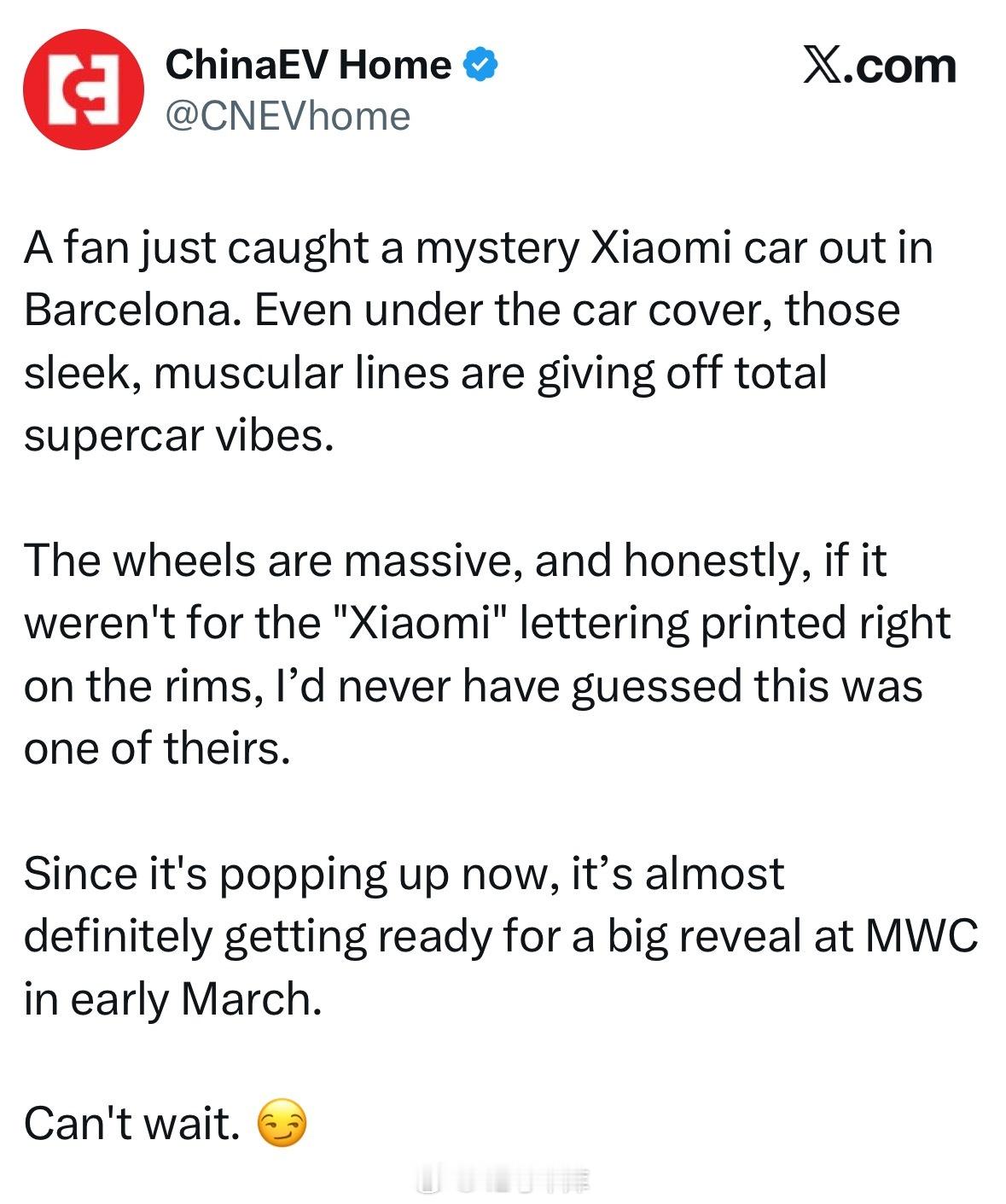 小米有超跑了?ChinaEV Home 爆料巴塞罗那有人拍到了一辆跑车,后轮毂上写的 XIAOMI。这辆车很可能在下个月的 MWC 大会上亮相。