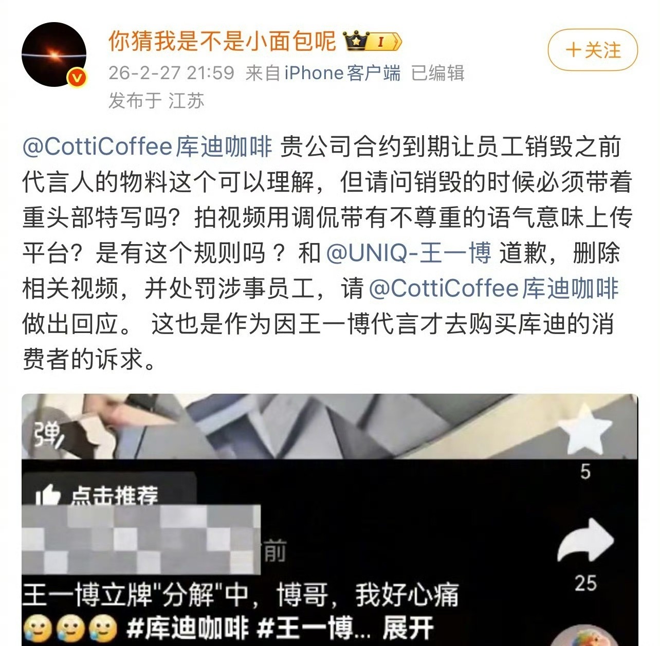王一博家在向库迪咖啡维权,要求品牌方出来道歉。