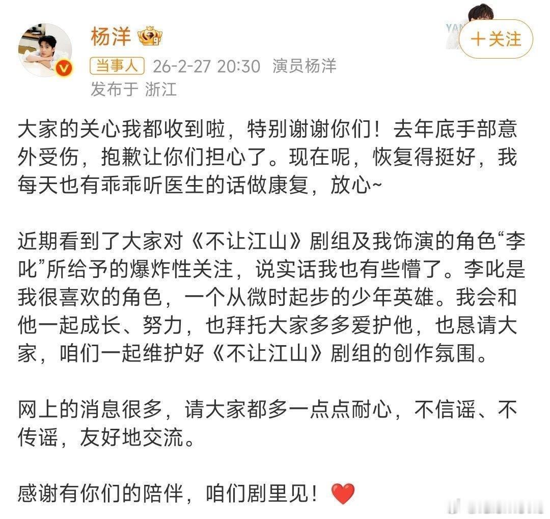 杨洋发文回应不让江山争议依旧是体面有教养,顾全大局的杨洋,顶好顶好的人,人品这一块,没得说,粉丝也是最好的粉丝,看到他们说让杨洋退至他们身后,粉丝为杨洋撑起一片天,为他遮风挡雨,我看后很感动,世界纷纷扰扰,世道充满不公,但总有人拥有逆流而上的勇气,这份勇敢定能不让江山。