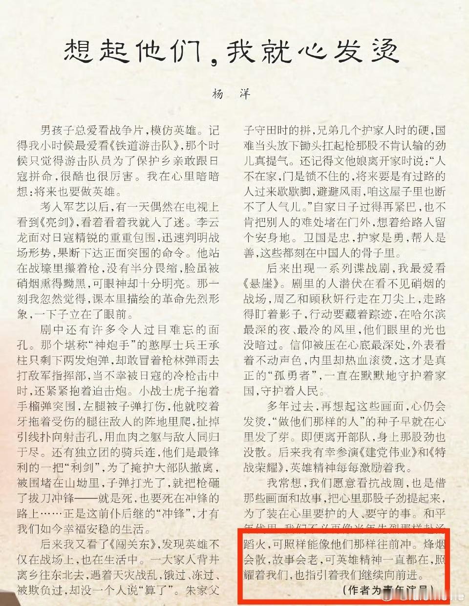 我记得杨洋在人民日报撰文写过一句话,“烽烟会散,故事会老,可英雄精神一直都在,照耀着我们,也指引着我们继续向前进”,身处和平年代,怎么传承这种精神?始终提着一股劲儿,杨洋是演员,作品是基,对演戏这件事保持敬畏心,不辜负每一位观众的期待,以滚烫的热情诠释人生角色,造就天选角色,让自己的表演独一无二,生根发芽,璀璨星空。