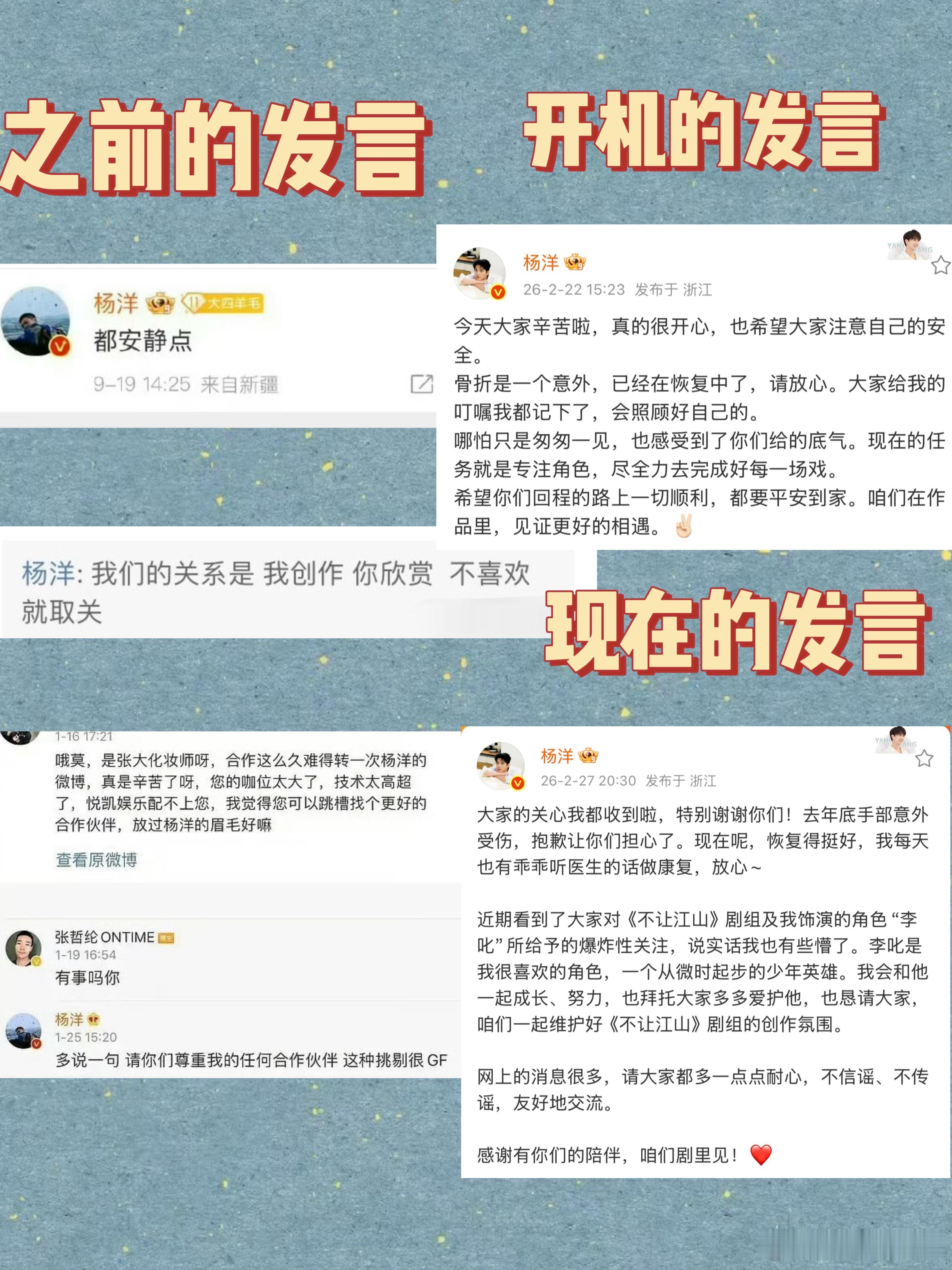 粉丝整理了杨洋前后开机发言,并列举出了多条不符合日常生活的习惯比如杨洋不爱喜欢用标点符号爱用空格且手部正在养伤,《不让江山》维稳长文究竟是谁发出的?除了剧本外,粉丝现在也不满倭风妆造