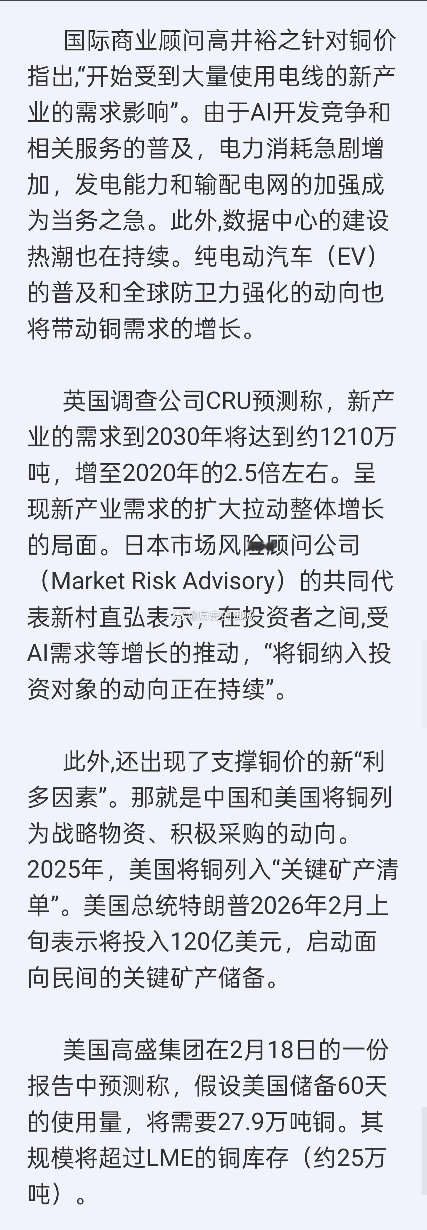 英国调查公司CRU预测称,新产业的需求到2030年将达到约1210万吨,增至2020年的2.5倍左右。呈现新产业需求的扩大拉动整体增长的局面。标普全球能源预测显示,如果没有新增矿山开发和现有矿山的扩张,矿山产量将在2030年达到2700万吨的峰值之后转为减少。另一方面,需求到2040年将比现在增加50%,有可能出现1000万吨的供给缺口。海外新鲜事