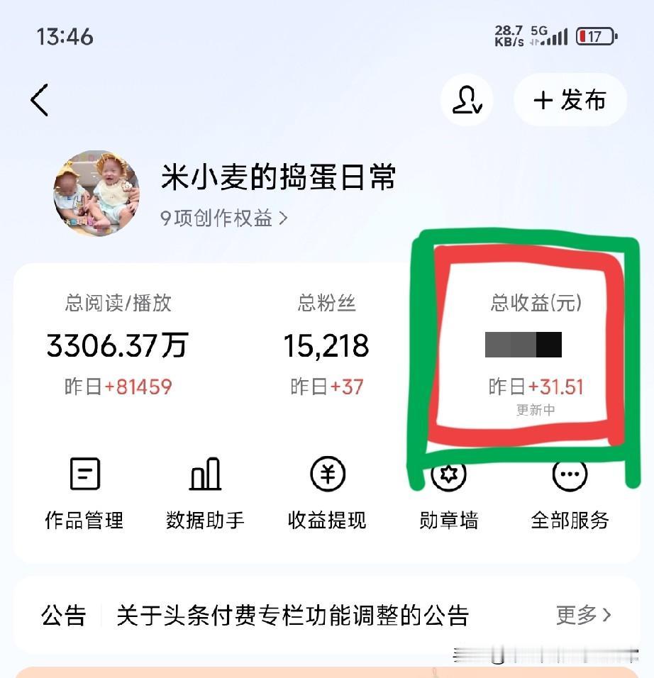 头条给我的菜钱,比老公给的还准时😂 谁懂啊家人们!在头条写了大半年,总收益刚破万,昨天又入账31块5。这点钱在别人眼里可能连杯奶茶都不够,但对我来说,就是每天菜市场的底气——不用伸手要钱,就能给娃买最新鲜的草莓,给自己添一把嫩菠菜。 昨天单篇8万多播放,评论区吵翻了天。有人说我这点收益也好意思晒,也有人说终于看到普通人做自媒体的真实样子。其实我哪是什么博主,就是个带娃间隙挤时间敲字的宝妈。1.5万粉丝,3300万播放,每一分钱都是深夜哄睡后,在手机上一个字一个字敲出来的。 以前总觉得,全职妈妈的价值只能体现在家里的灶台和孩子的笑脸上。现在才发现,原来我也能靠自己的笔,赚回属于自己的尊严。这31块5,不是钱,是我对自己的肯定。 你在头条赚过钱吗?是补贴家用还是纯粹爱好?