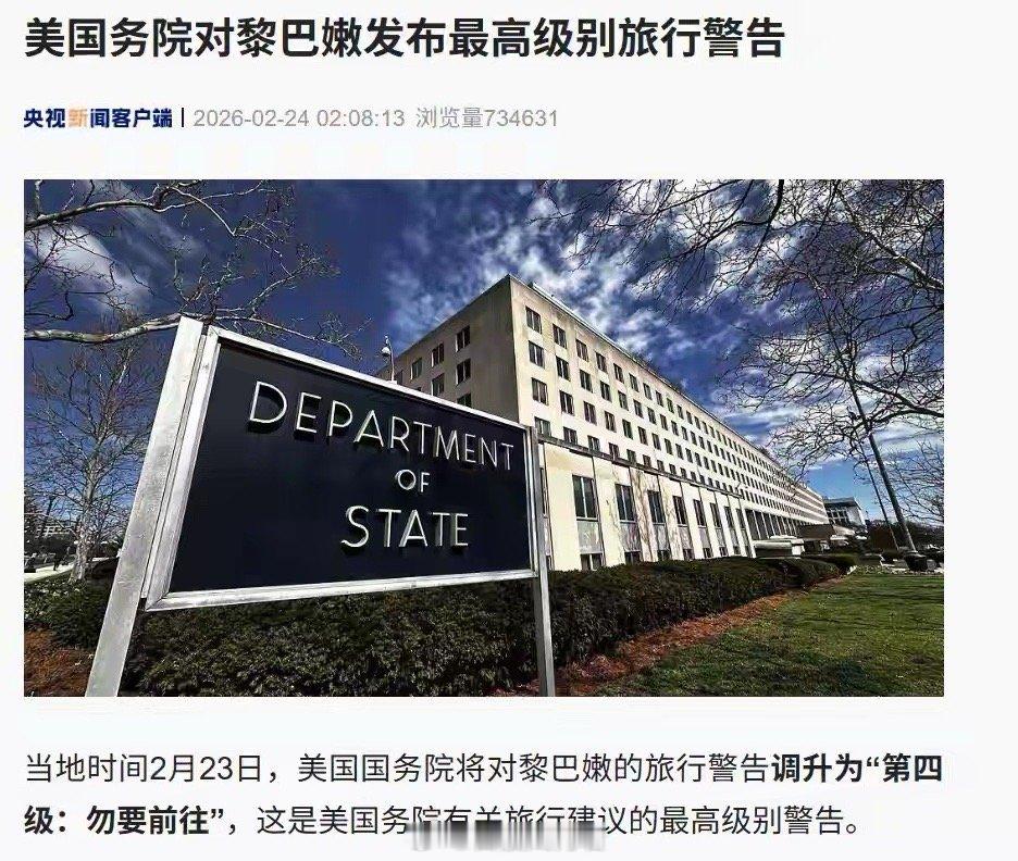 局势紧张之下,美国方面采取了紧急措施。当地时间23日,美国国务院将黎巴嫩旅行警告调升至最高级“第四级:勿要前往”,理由包括“犯罪、恐怖主义、社会动荡、绑架、未爆地雷及武装冲突风险”,尤其指出边境地区风险更高。同日,美方下令驻黎巴嫩大使馆非紧急政府工作人员及家属撤离,要求使馆人员未经批准不得个人出行,并提示可能随时收紧出行限制。