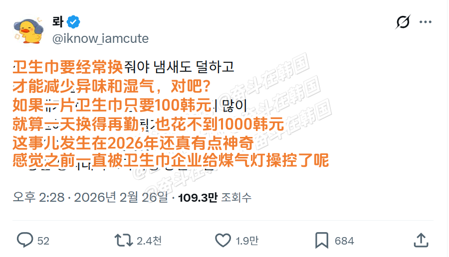韩女感叹低价卫生巾这事发生在2026年有点神奇 海外新鲜事 热点现场 (韩国daiso与清洁国度公司合作,推出10片装1000韩元(每片100韩元)的卫生巾)