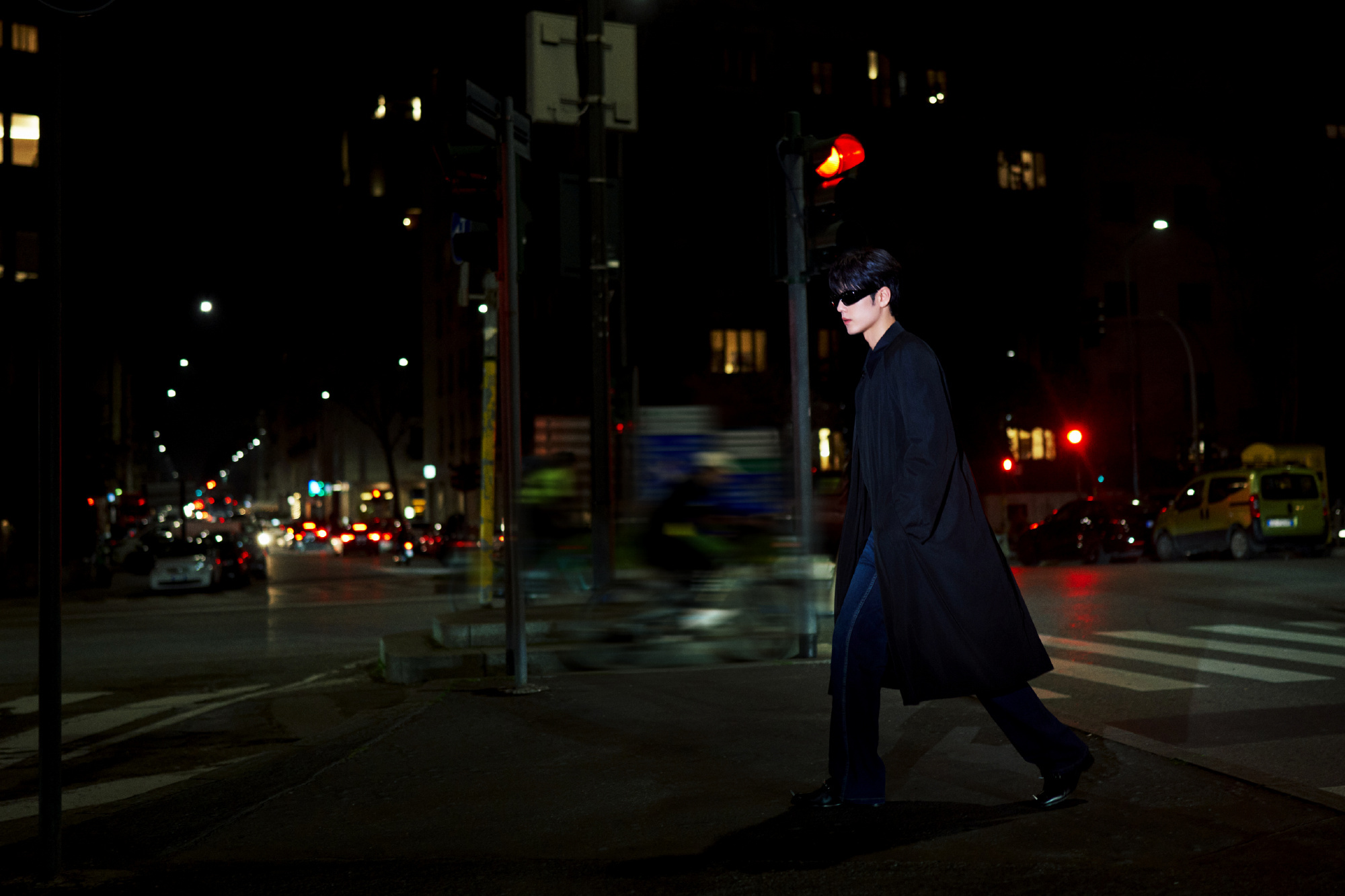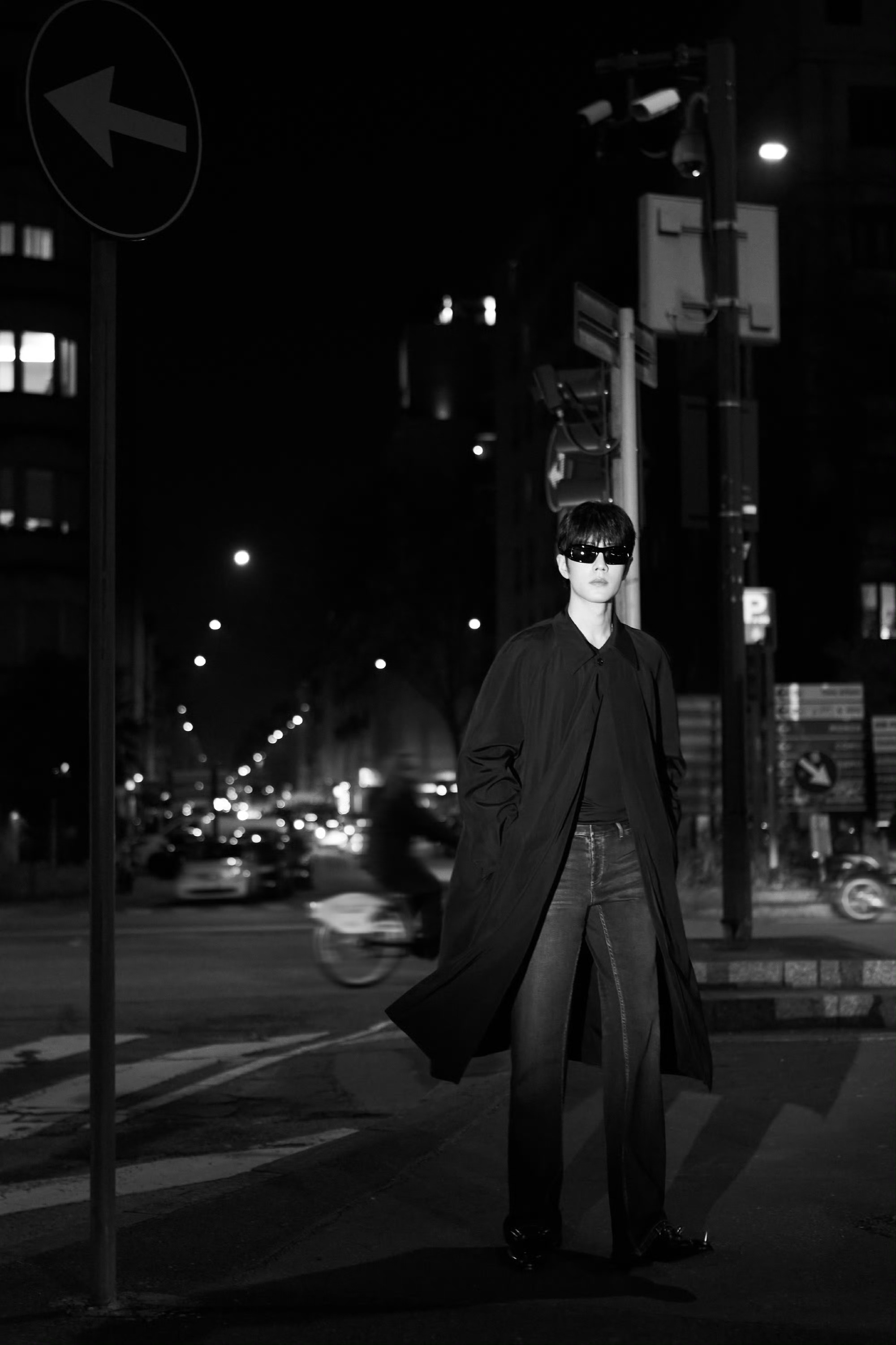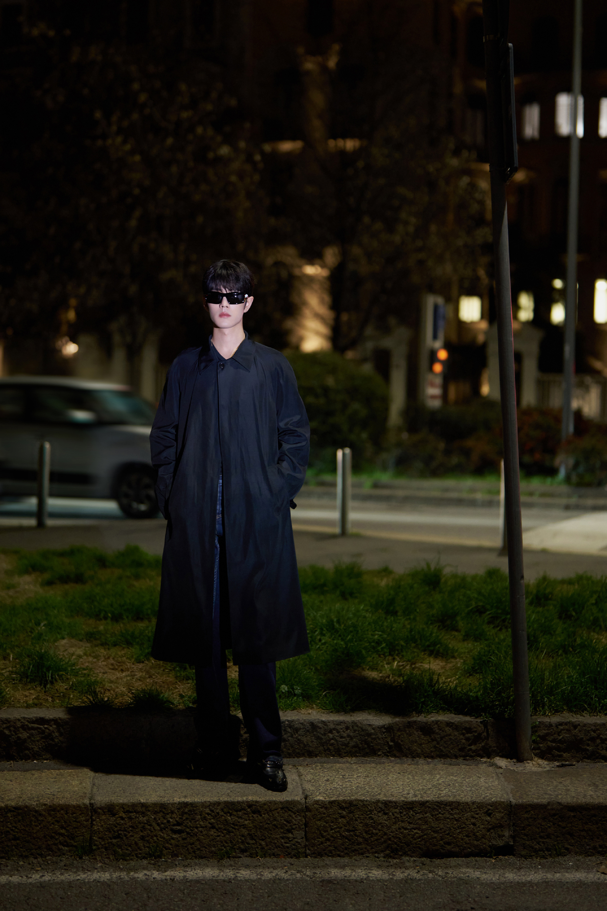 品牌代言人肖战大秀前大片,身穿黑色长款大衣,戴墨镜造型,自带摩登绅士氛围感。