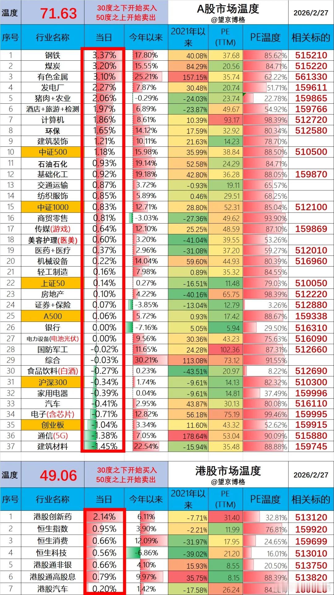 (1)ETF账户今日盈利+0.1万(资产260万);(2)基金账户今日预估盈利+3.0万(资产550万);两个账户合计预估盈利+3.1万,预估盈亏比例+0.39%。周二盈利+4.1万,周三盈利+3.9万,周四盈利-7.9万,周五盈利+3.1万,本周累计盈利+3.2万。本周操作汇总等明天周报披露。今日温度:A股今天71.63度,相比上一个交易日上升0.4度;港股今天49.06度,相比上一个交易日上升0.8度;港股创新药涨了2.14%,算是把昨天的暴跌补偿回来一些。感谢点赞与点爱心~基金恒生科技