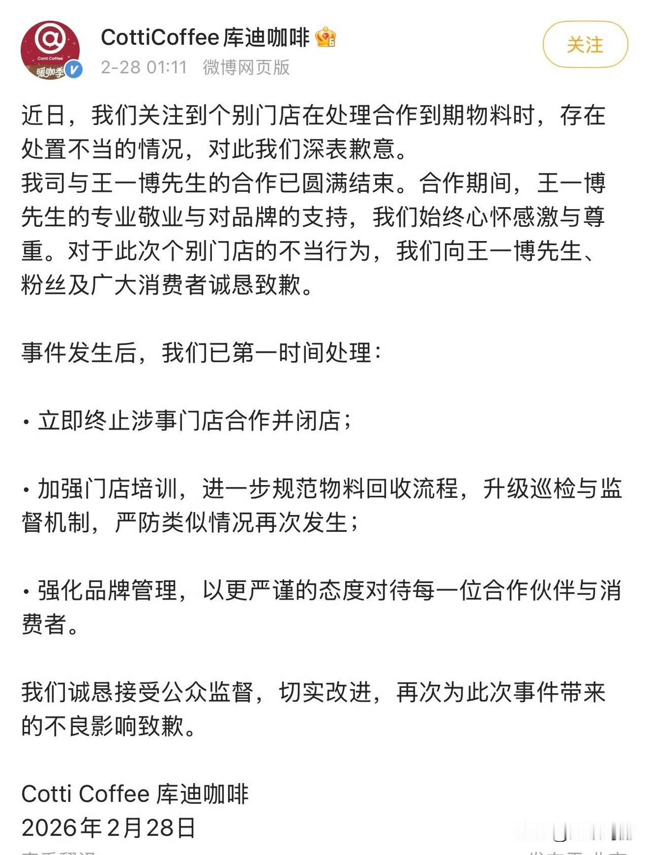 库迪咖啡给代言人王一博道歉了 终止了门店合作并闭店 加强培训和管理