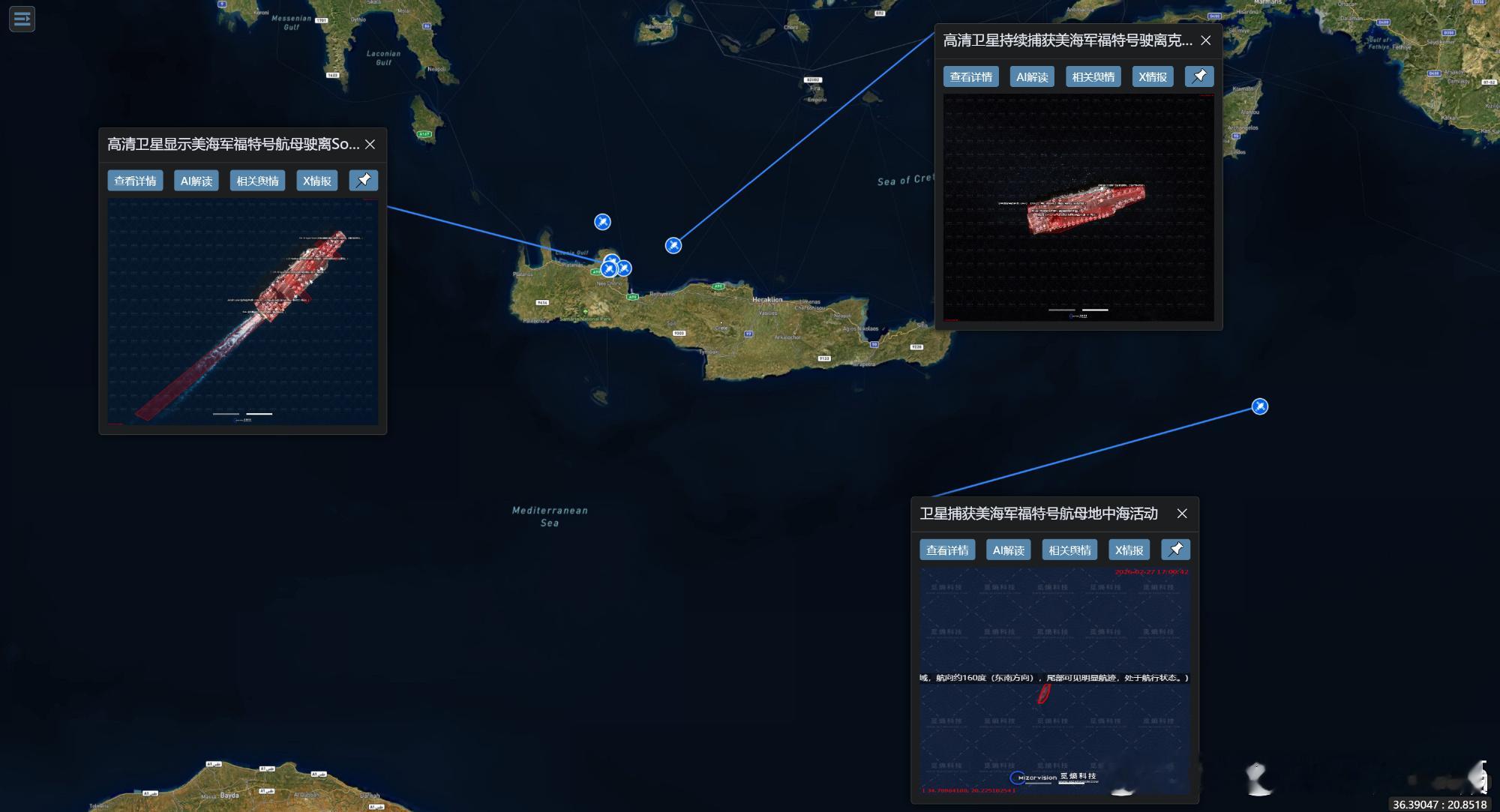 东方某大国的商用卫星:地中海,捕获美国海军福特号航母的活动。美国双航母已就位海外