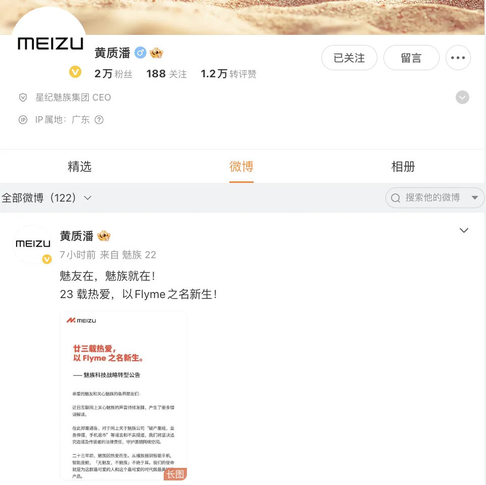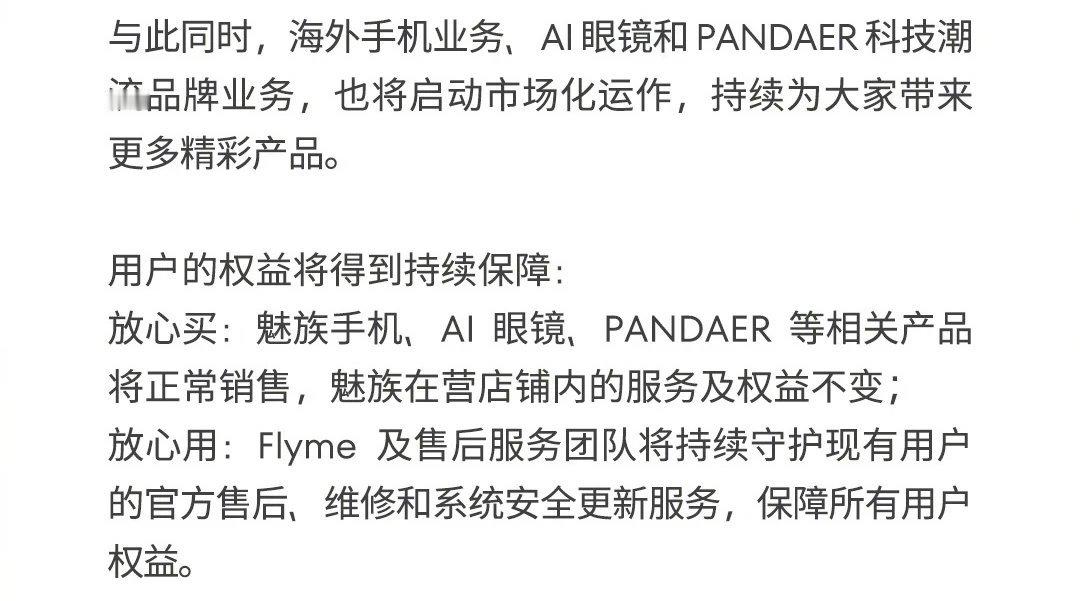 与此同时,海外手机业务、AI眼镜和PANDAER科技潮流品牌业务将启动市场化运作,持续为用户带来更多精彩产品。公告最后重申了魅族与用户的情感连接:“无魅友,不魅族。魅友在,魅族就在!”