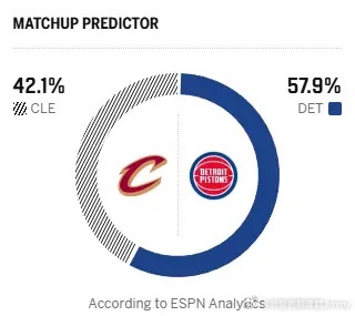 ESPN预测明日比赛:活塞胜率57.9%,骑士胜率42.1%。