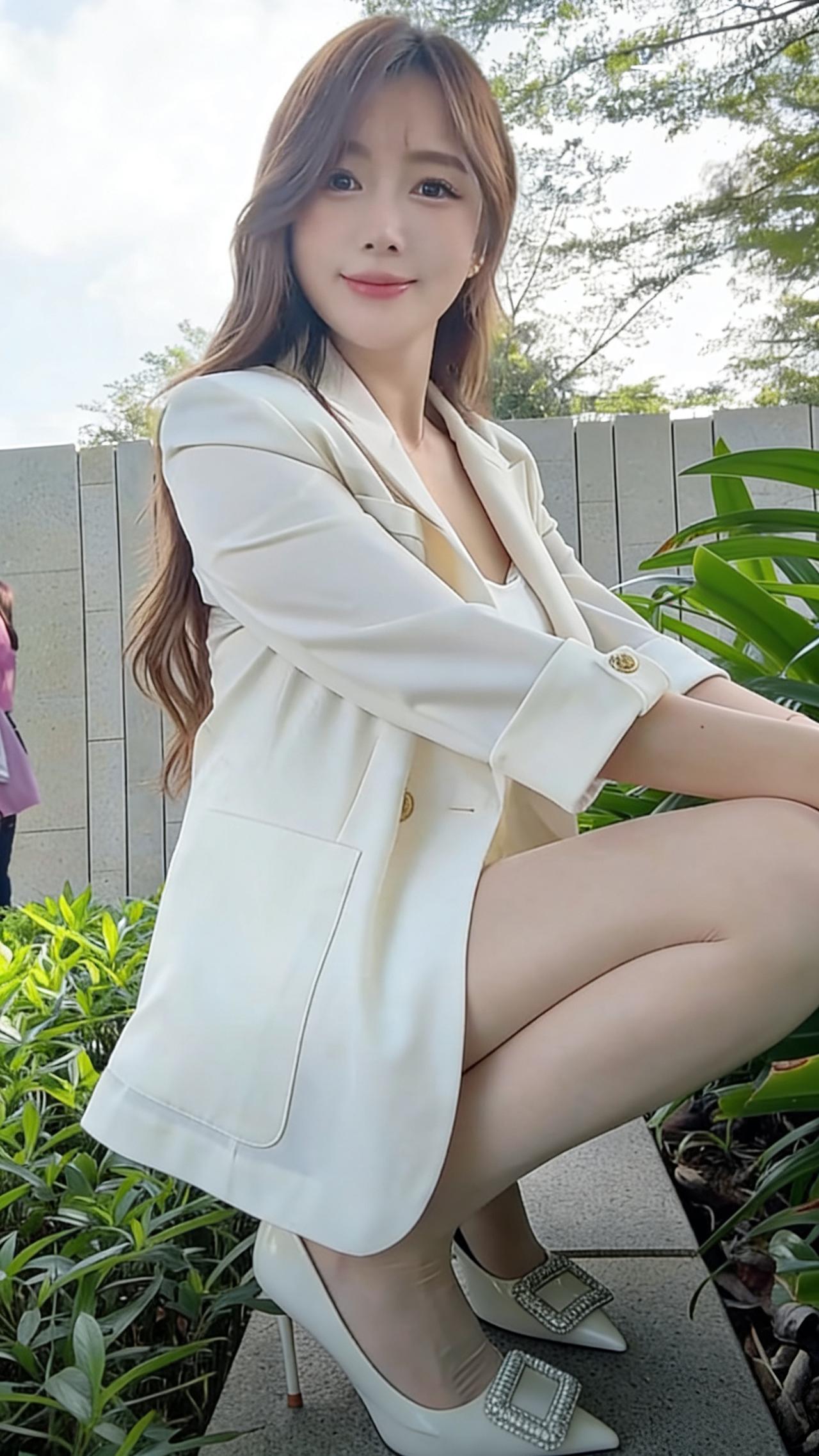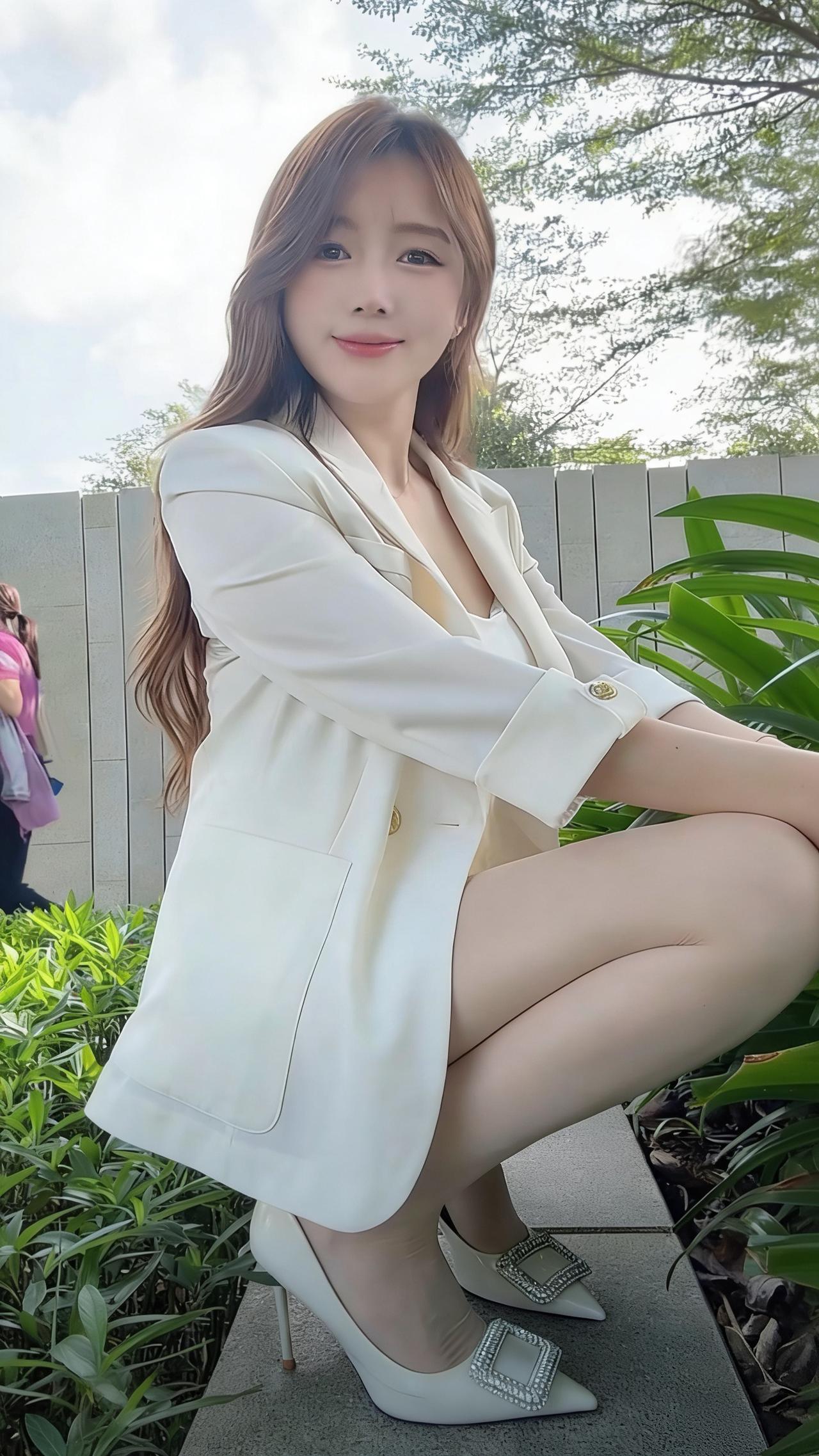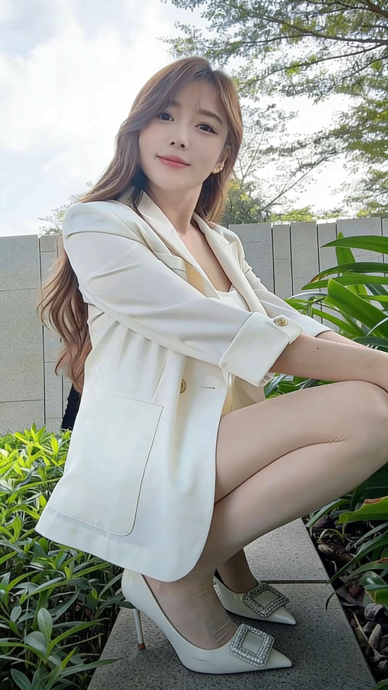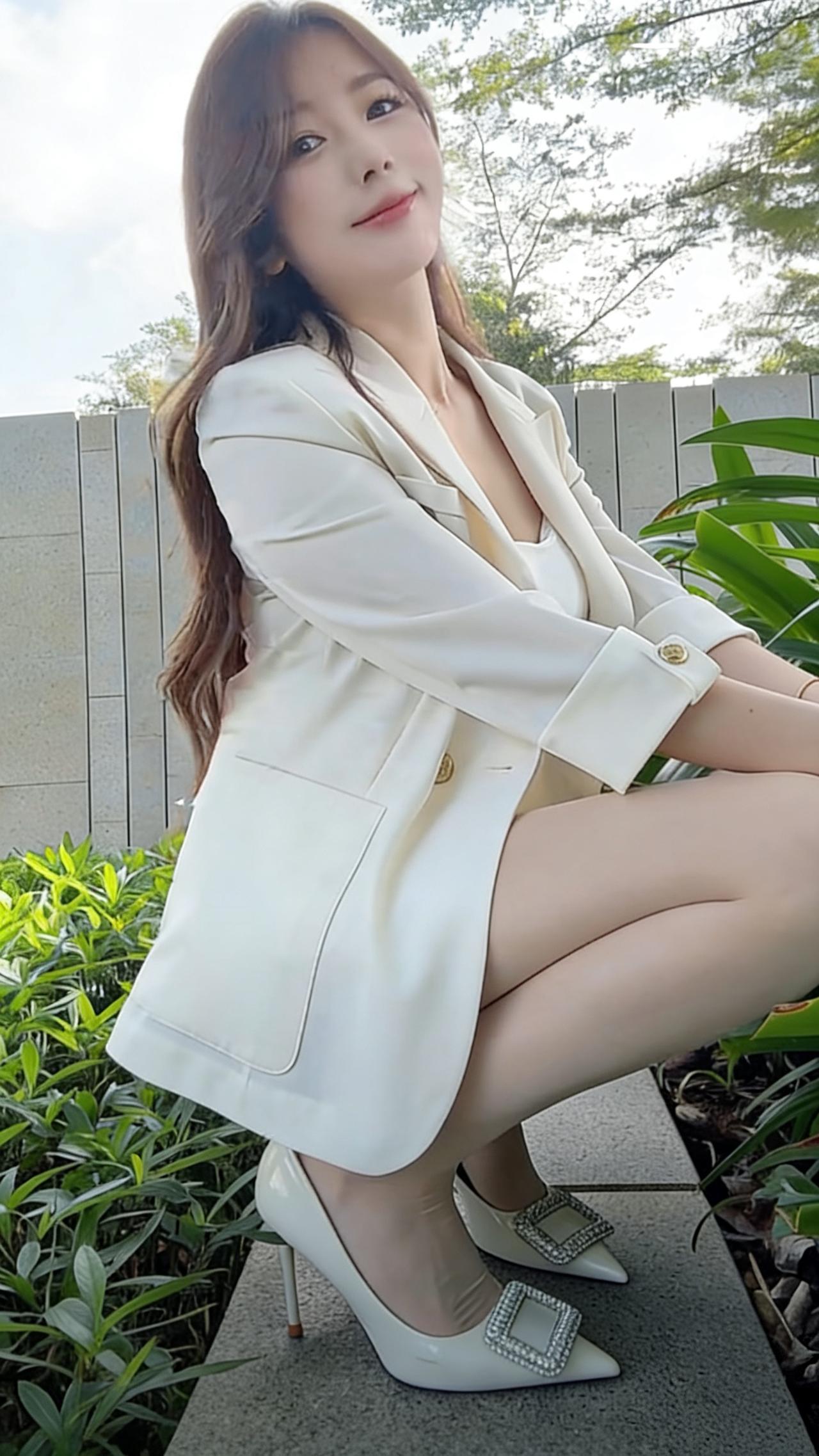 她的双腿线条修长,搭配肤色透明丝袜,在光线下若隐若现,更添了几分柔媚。脚上是一双白色尖头细高跟,鞋面上镶嵌着满钻的方形饰扣,在阳光下闪耀夺目,既优雅又充满了设计感。 在绿意盎然的户外背景下,她的整体造型干净利落,又带着一丝不经意的性感,将知性与妩媚完美融合。
