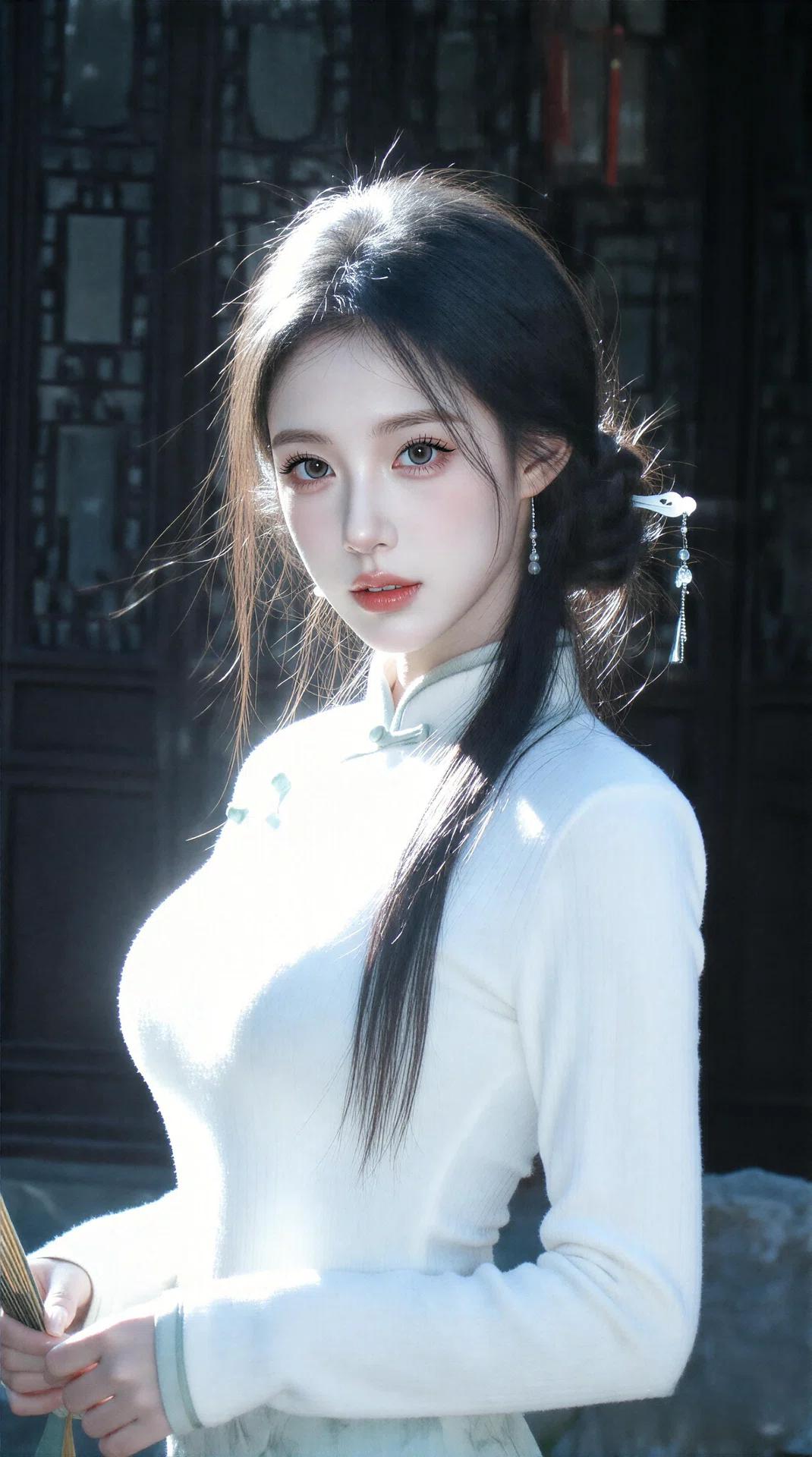 她的长发被精心挽成一侧的低髻,用一支素雅的玉簪固定,几缕碎发在风中轻扬,耳畔垂着银质流苏耳坠,随着动作轻轻摇曳。 在古色古香的木格窗前,她手持一把素色折扇,阳光透过窗棂洒在她的肩头,为她镀上一层温柔的光晕。她的眼神清澈,唇色是淡淡的朱砂红,整个人宛如从江南水墨画中走出的佳人,既有东方女子的温婉娴静,又带着一丝不经意的灵动与韵味。