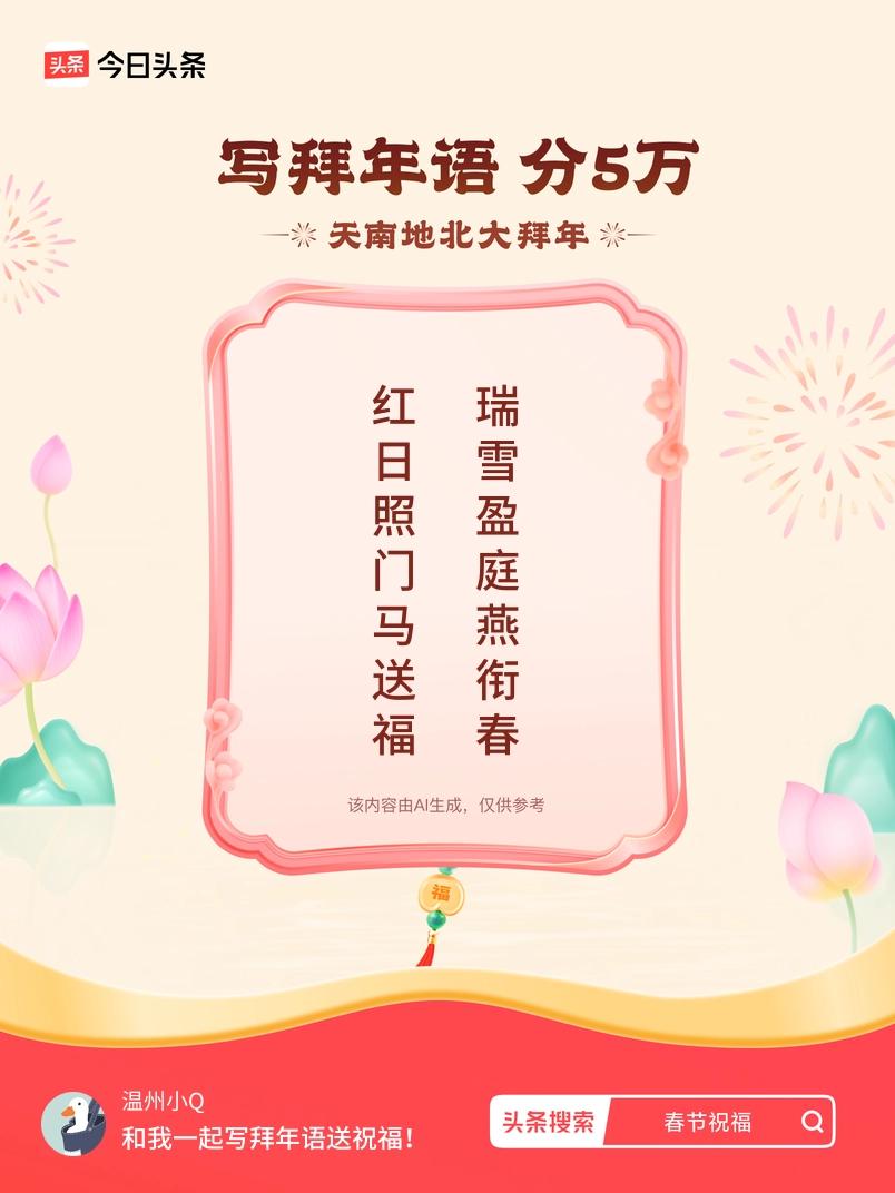 写拜年语送祝福新春拜年送祝福!我的祝福是:“红日照门马送福,瑞雪盈庭燕衔春”!快来一起写祝福吧戳这里,一起领红包>