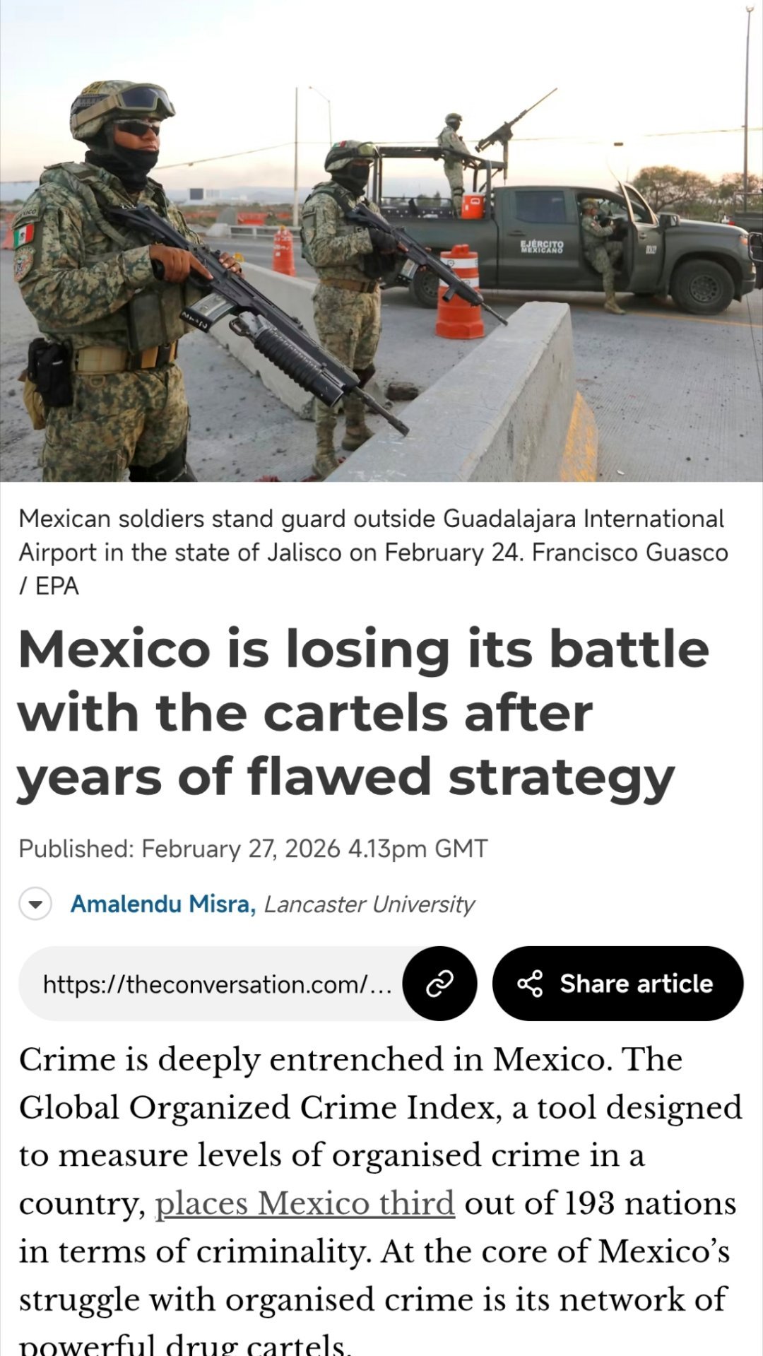³ 全球有组织犯罪指数将墨西哥列为193个国家中犯罪率第3高的国家。GDP增长乏力,年轻的墨西哥人只能去贩毒集团找工作,像哈利斯科新一代在墨西哥每个州都有业务,甚至海外也有,解决了大量就业。这些人的想法是:“墨西哥的毒枭们或许不会将自己的贫困归咎于国家或社会——毕竟,每个人都是独立个体——但他们也丝毫不为自己的罪行感到悔恨。他们告诉我,他们“不幸”生于贫寒,而他们的受害者则“不幸”挡在了他们的路上。”热点科普