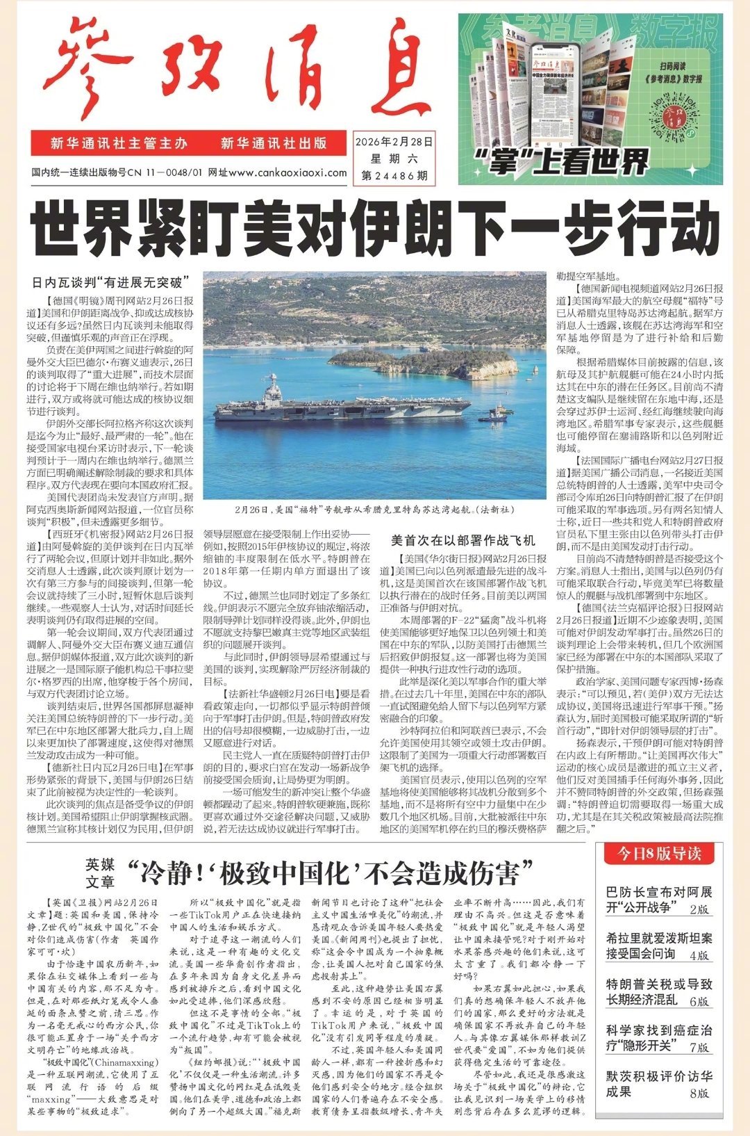 今日报纸头版:①#世界紧盯美对伊朗下一步行动#②英媒文章:“冷静!‘极致中国化’不会造成伤害”更多消息请关注→网页链接