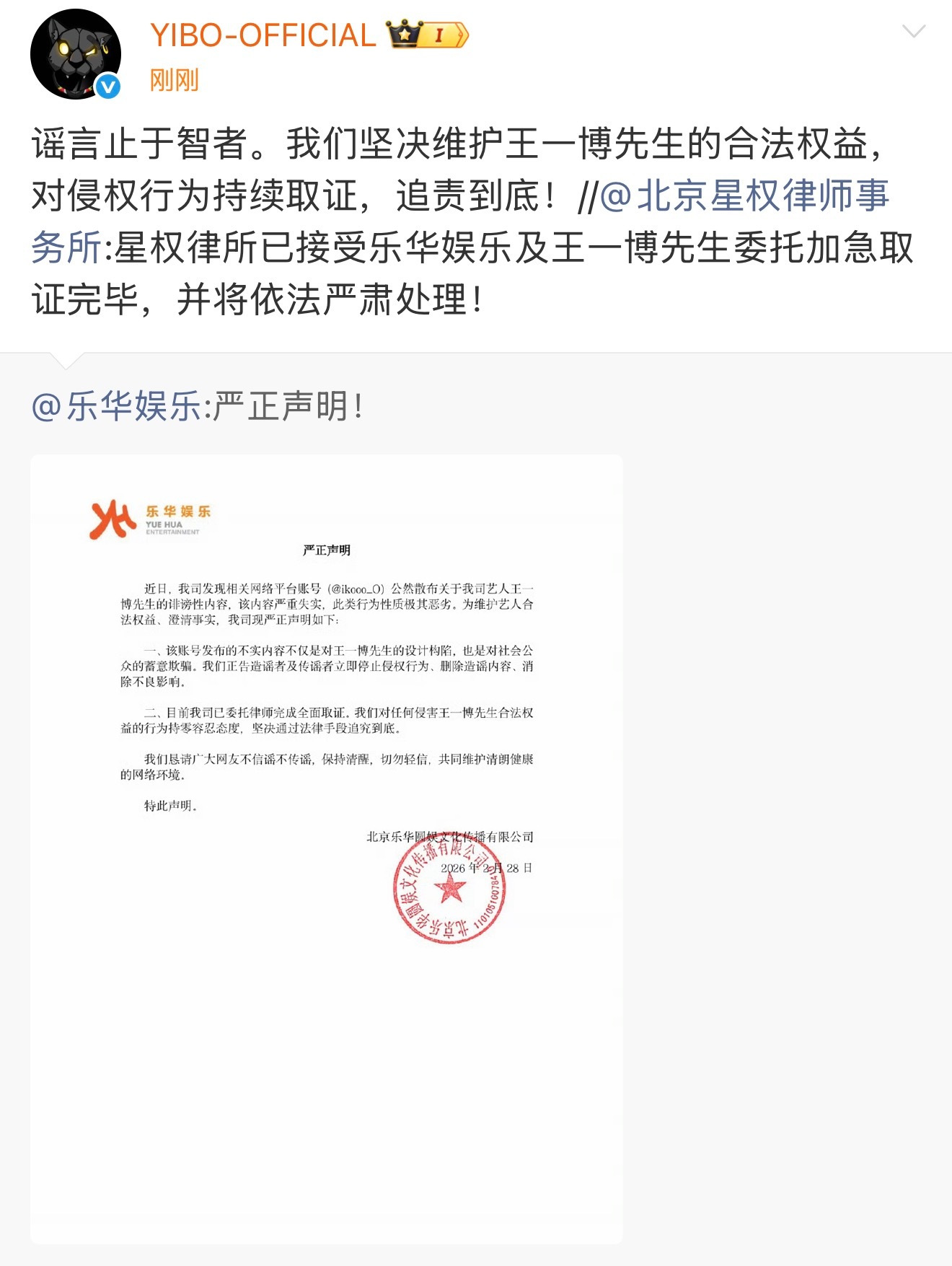 王一博聊天记录乐华辟谣了,说是诽谤,内容严重失实,设计构陷。我这里建议直接告