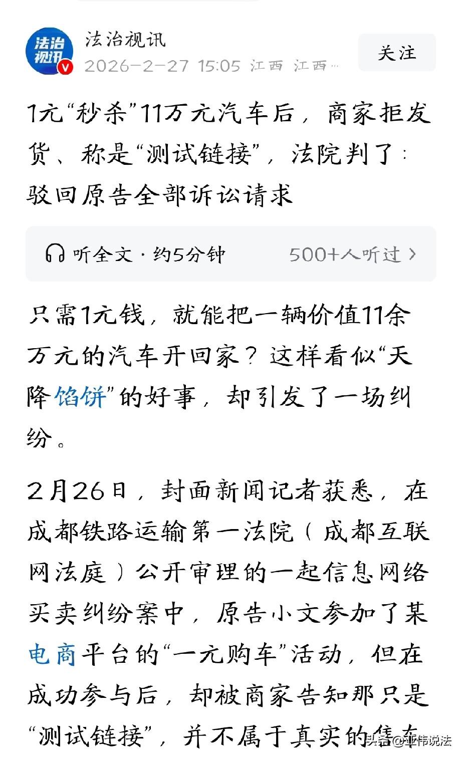 大无语!四川成都,小伙浏览电商平台发现,某汽车公司官网有1元“秒杀”活动,只需花1元就可以抢购价值11万多的汽车,他果断下单,以为捡到了大便宜。不料,下单没多久,商家回复这只是测试链接,并不是真的销售车辆,以系统错误为由,拒绝发货,并退还了他的1块钱。小伙不服气,闹上法庭,要求商家承担违约责任,赔偿他118900元,结果法院的判决出乎小伙意料! 小伙小文平时就喜欢在电商平台上逛逛,看到划算的活动总会多留意几眼。 这天,他像往常一样刷着手机,突然在一家汽车公司的官方店铺里,看到了一条让他心跳加速的商品链接。 一辆市场价11万多元的汽车,标价竟然只要1元,还标注着“秒杀”活动。 小文高兴坏了,天底下居然有这么好的事?官方店铺总不会骗人吧。 他反复点开页面确认,有车型图片、有购买按钮,流程和普通网购一模一样,完全没多想就果断下单付款。 1元钱成功支付的那一刻,小文觉得自己简直是撞了大运,以为捡了个天大的便宜,就等着商家发货提车了。 可这份喜悦没持续多久,泼头冷水就来了。 商家很快联系上小文,态度很明确:这个1元购车的链接,根本不是正式销售活动,只是后台测试链接,因为员工操作失误才意外上线,所以不能发车,只能退还这1块钱。 小文一听当场就火了,明明是官方店铺明码标价,我正常下单付款,订单都成功了,现在说不发就不发? 他越想越不服气,觉得商家就是出尔反尔,拿系统错误当借口。 小文觉得自己付出了时间和精力,就是冲着官方活动来的,凭什么商家一句话,自己的“新车”就没了? 和商家多次沟通无果后,小文直接把汽车公司和电商平台一起告上了法庭,要求商家履行合同,要么交付车辆,要么赔偿车辆价值118900元。 小文为此还请了律师,声称商家作为专业主体,在平台上公开发布商品信息,就应该承担相应责任,现在拒绝发货,已经构成根本违约。 法庭上,商家不断的解释,这个链接从头到尾都是测试用的,根本不是用来卖车的。 他们这个页面上漏洞百出,品牌和生产厂家对不上,车型是电动车,描述里却写着“1.5手动”,电动车根本没有手动挡。 商家认为,一个正常、理性的消费者,看到这些明显矛盾、荒唐的信息,就应该意识到这不是正常的购车链接。 而且发现订单后,他们第一时间就联系小文道歉、说明情况并提出退款,已经尽到了责任。 商家强调,他们从来没有要1元卖车的真实意思,只是后台失误,双方根本没有达成真实的买卖合意,合同自然不算成立。 电商平台也表示,他们只是提供平台服务,这件事和平台无关,不应该承担连带责任。 小文却坚持认为,作为一个普通消费者,他没有能力、也没有义务去分辨商家后台的技术问题。 页面有图、有价、有购买键,就是标准的购物界面,自己完全是出于信任才下单,商家用内部错误逃避责任,就是不讲诚信。 对此,法院会如何审理呢? 《民法典》第四百七十二条规定:要约是希望与他人订立合同的意思表示,该意思表示应当符合下列条件: (一)内容具体确定; (二)表明经受要约人承诺,要约人即受该意思表示约束。 网络购物中,商家发布商品信息是要约,消费者下单是承诺,只有商家信息构成有效要约,合同才可能成立。 而判断是否为有效要约,必须严格适用以上两个条件。 法院审理查明,案涉商品链接确实存在品牌不符、配置错误、价格严重偏离市场价等多处明显问题,并不符合正常商品销售的信息要求。 这些漏洞说明,该链接并非真实、完整的商品销售信息,无法让消费者明确知晓交易标的、规格、真实价格等核心内容,不构成法律意义上的“具体确定”。 法院认定,商家发布该链接的真实目的是后台测试,并非对外销售车辆,且发现订单后立即联系消费者致歉、退款,明确拒绝履行发货义务。 综上,商家的1元购车链接并不构成有效要约,消费者下单也不产生“承诺”的法律效果,双方未达成真实一致的买卖合意。 最终法院认定,小文和商家之间的购车合同并未成立,也就不存在违约一说,据此驳回了小文的全部诉讼请求。 一场看似“天上掉馅饼”的秒杀,最后以小文的败诉收场,不仅没能白嫖到车,反而白白搭进去律师费和诉讼费。 网购遇到离谱低价时,一定要多留个心眼,别被一时的惊喜冲昏头脑,最后得不偿失。 对此,你怎么看?