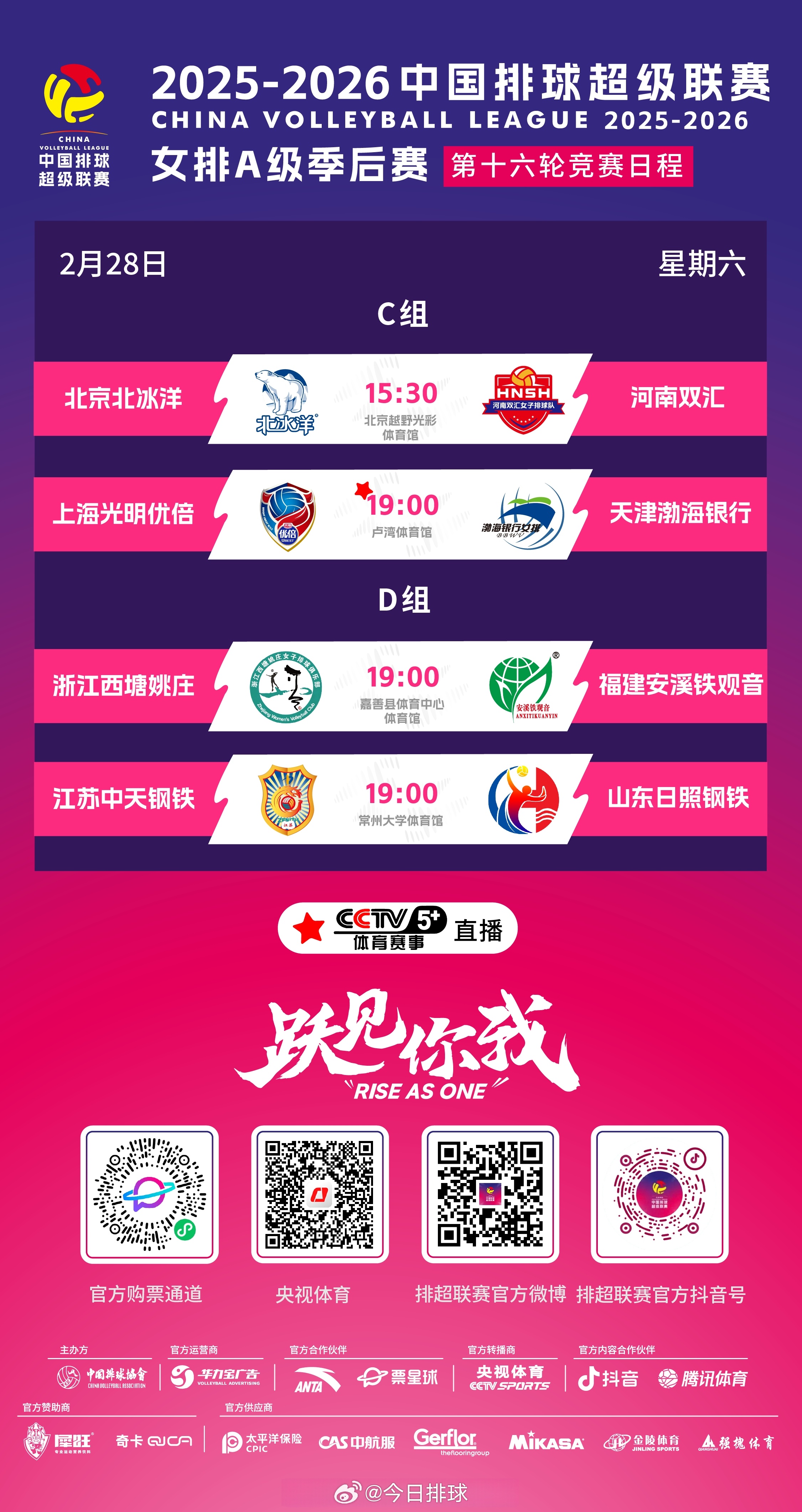 2025-2026中国女排超级联赛 A级季后赛今天进行总第16轮的比赛,具体的竞赛日程是(主队在前):