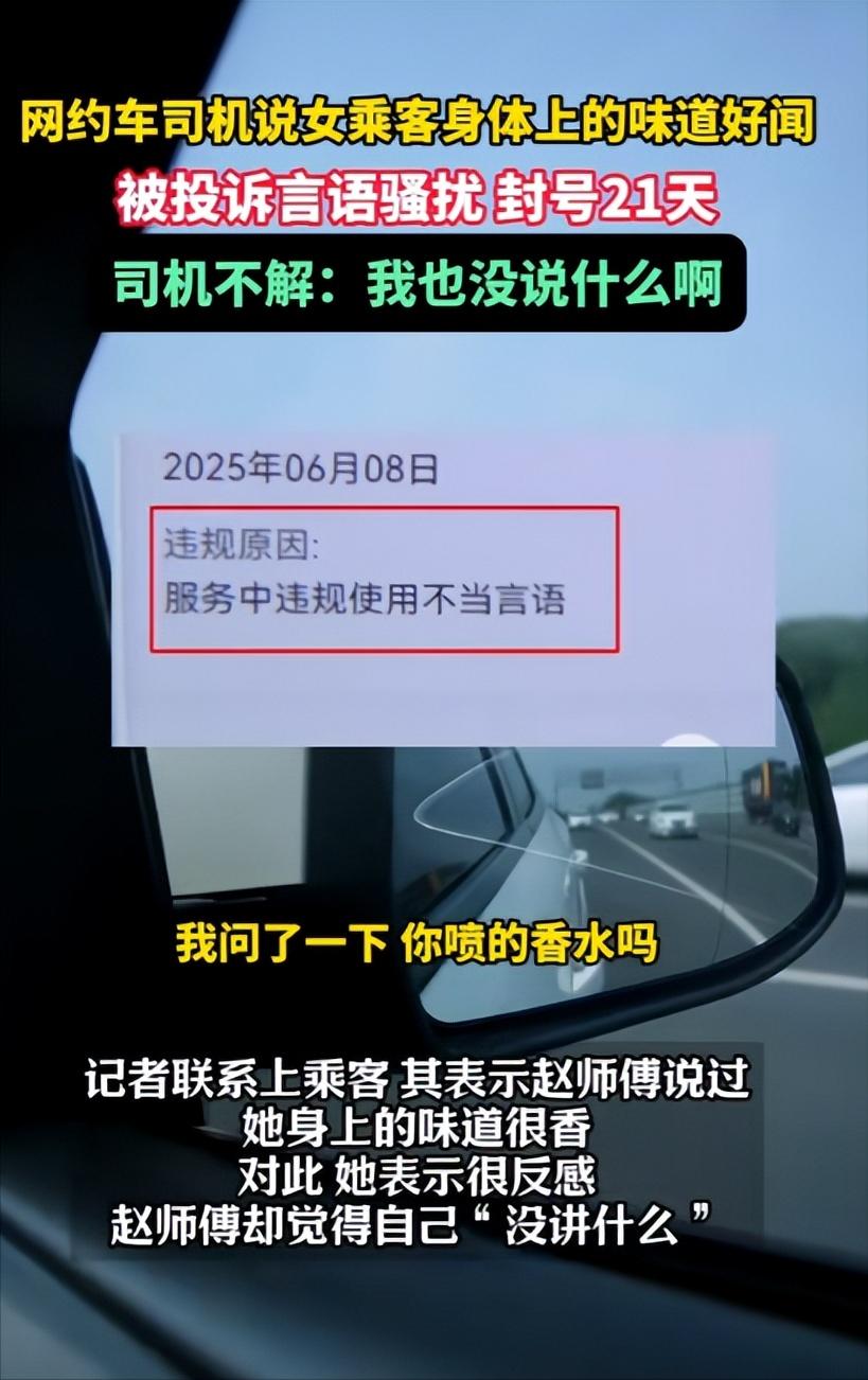 “祸从口出。”浙江,一男网约车司机,无意间闻到女乘客身上的气味很香,就问她用的是什么香水,女乘客答用的是洗衣液,不料,女乘客下车没多久,司机就受到了惩罚,他实在想不通,便找记者求助。 2025年6月8日傍晚,赵师傅接到的是一位年轻女乘客,上车后,女乘客就默默坐在后排,全程戴着耳机,眉眼间满是疲惫,一看就是不想被人打扰的样子。 密闭的车厢里,空气流通不畅,赵师傅无意间闻到一股清新的淡香,不刺鼻、不浓烈,像是刚晒过的衣服那种干净的味道,他本身对气味就比较敏感,越闻越觉得舒服。 一时没忍住,他就开口询问了女乘客,想知道这香味来自什么香水,甚至忍不住提了一句自己很喜欢这个味道。 女乘客听到问话后,不耐烦地摘下耳机,简单说了一句不是香水,是洗衣液的味道,之后就重新戴上耳机,再也没有多余的反应。 赵师傅见状,也没有再多问,安安静静地专心开车,全程再没有主动搭话,他心里还盘算着,等忙完这单,就去问问这款洗衣液的牌子,买回家改善一下车内的气味,让乘客坐车也能更舒服。 女乘客下车还没半个小时,赵师傅的手机就收到了平台的处罚通知,上面清清楚楚写着,他因存在言语骚扰乘客的行为,账号被封禁21天,还要强制参加反骚扰培训。 看到通知的那一刻,赵师傅整个人都懵了,手里的手机差点掉在地上。 他反复回想整个行程,自己没有说一句脏话,没有任何肢体接触,甚至没有死缠烂打,只是单纯觉得香味好闻,随口问了一句,怎么就成了言语骚扰。 委屈和着急一下子涌上心头,21天不能接单,就意味着21天没有收入,家里的房贷车贷、老人的医药费、家人的生活费,每一笔都等着他来承担,这突如其来的处罚,让他瞬间陷入了绝境。 左思右想,他还是想不明白自己错在哪里,无奈之下,只能联系上1818黄金眼的记者求助,把事情的来龙去脉一五一十地说了出来,只求能得到一个合理的解释,哪怕真的是自己错了,也要弄清楚错在何处。 记者介入后,联系到了当事女乘客,才了解到她的真实感受。 那天女乘客加班到很晚,整个人身心俱疲,上车后唯一的想法就是安安静静休息一会儿,缓解一天的疲惫。 可赵师傅反复提及她身上的气味,还不停追问相关问题,在密闭、无法随时脱身的车厢里,这种持续的关注让她感到很不适,甚至有些后怕,下车后越想越觉得没有边界感,才选择在平台上投诉,维护自己的感受。 随后,记者又联系了网约车平台客服,核实处罚的相关情况。 客服回应,平台判定言语骚扰,并不是只有脏话和轻浮调侃才算,多次评论乘客身体气味、无视乘客的抵触情绪、持续追问私人问题,都属于越界行为。 而且平台并不是单方面听信女乘客的说法,而是完整调取了车内的录音,确认赵师傅存在多次询问的行为后,才做出了处罚决定,核心就是为了保护乘客的个人边界和心理安全感,这也是网约车服务的基本底线。 这件事传开后,很快引发了全网热议,网友们分成了两大阵营。 一部分网友替赵师傅喊冤,觉得他只是出于善意,没有任何恶意,既没有冒犯的举动,也没有低俗的言语,21天的封号处罚太严厉,直接断了一个普通家庭的生计,实在太不合理。 另一部分网友则表示理解,认为在密闭的车厢里,陌生男司机反复提及女乘客的身体气味,确实会让女乘客感到被冒犯,尤其是女乘客已经释放出不想交流的信号,赵师傅却没有察觉,投诉和处罚都是合理的。 说到底,这件事从来都不是一句“问香水”那么简单,而是陌生人之间相处的分寸感问题。 网约车车厢是一个特殊的密闭空间,司机和乘客互不相识,尊重边界才是相处的基础,乘客的沉默从来都不是默许,而是最温和的拒绝。