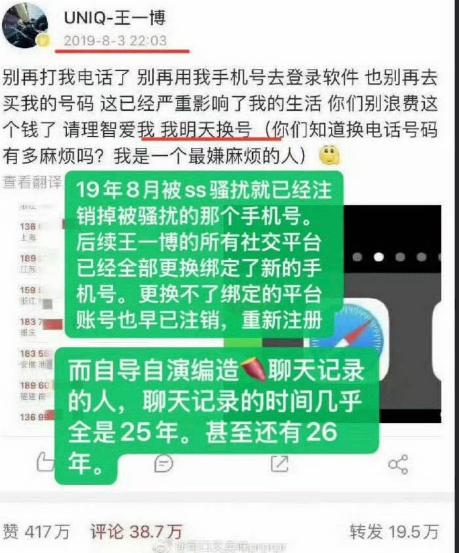 王一博的聊天记录是真的还是假的啊,我就说三个事情,大家就知道了 第一,他的这个手机号,6年前就被有心人拿到了,王一博甚至还发了文,希望某些人,别再用他的手机号登录各种软件了,因为换手机号非常的麻烦 之后,拿到这个手机号的网友,就开始布局了,结果登录的时候,需要验证姓名,她就把自己给暴露了,登录王一博账号的人,姓李,名字就不说了,大家一搜就知道了 这是因为她第一次截图的时候不小心,没把自己的名字给打码,后续发的时候又改了,但是名字已经被大家给截图了,所以登录这个账号的并非王一博本人 除此之外,就是ip地址,第一次发是在黑龙江,第二次发是在澳大利亚,就怕大家把她的信息 第二,就是爆料人所说的,王一博在网上买了一双399鞋子的事情 王一博他还需要买鞋子吗?那么多品牌方争着给他寄,一看就是假的呀 人家代言的鞋都穿不过来还买399的鞋穿?,春晚5000多的鞋瞬间卖光,还用得着买300块没品牌鞋 造假的人不会以为399就是顶奢了吧?难怪会为了糊口不干人事。王一博身体可是广告位!一般物品能随便上身吗 第三,哪个明星会没事,和别人文字吐槽其他明星的不好,特别还吐槽了肖战4次,这不明摆着引战吗 小黑子是受不了王一博春晚舞台大爆的热度,还在蔓延吗? 现在换个头像 ,做个聊天局不是很正常吗,我觉得有理智的人,根本不会信这些玩意的