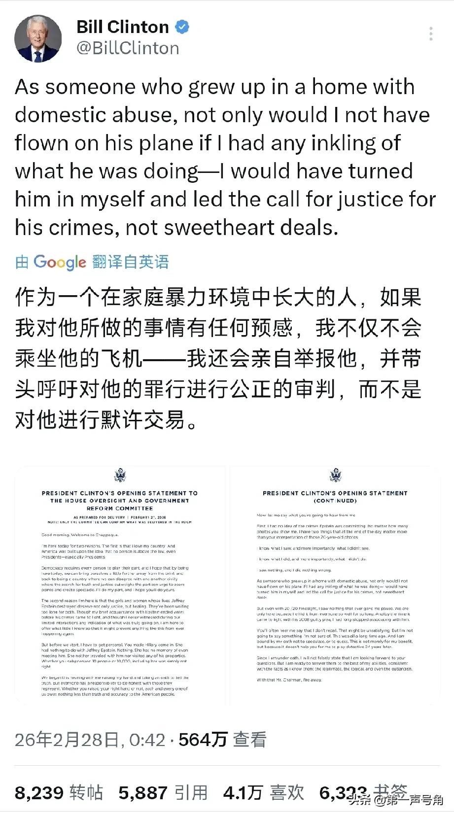 美国前总统比尔·克林顿今天(北京时间2月28日)写道:“作为一个在家庭暴力环境中长大的人,如果我对他所做的事情有任何预感,我不仅不会乘坐他的飞机我还会亲自举报他,并带头呼吁对他的罪行进行公正的审判,而不是对他进行默许交易。” 评几句 比尔·克林顿这番"事后诸葛亮"式的表态,堪称美国精英阶层道德表演的经典范本。一个"在家庭暴力环境中长大"的人,却对爱泼斯坦岛上未成年少女的尖叫充耳不闻二十余年——这种选择性失聪的共情能力,与其说是良知觉醒,不如说是危机公关的精密计算。 最讽刺的莫过于"亲自举报"与"公正审判"的铿锵誓言。当年与爱泼斯坦勾肩搭背、乘坐"洛丽塔快线"周游世界时,这位前总统的正义感大概正与莱温斯基的裙子一起锁在白宫的衣橱里。如今爱泼斯坦已"被自杀"于戒备森严的监狱,克林顿却忽然化身正义使者,这种"死无对证"后的勇敢,不过是将受害者的苦难转化为个人道德洗白的洗涤剂。 当克林顿夫妇与爱泼斯坦在慈善晚宴上举杯共饮时,当基金会接受其巨额捐款时,这种"默许"难道不是权力精英心照不宣的默契?如今将系统性包庇简化为个人"预感"的缺失,既是对制度性腐败的轻巧回避,更是对公众智商的公然羞辱。 这场迟到的忏悔,本质上是一场精心编排的免责仪式——用廉价的道德姿态,掩盖昂贵的权力共谋。