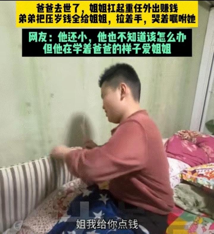 感动哭了! 爸爸去世了,姐姐扛起家庭重任要外出打工赚钱,年幼的弟弟悄悄把姐姐叫进房间,从自己的枕套里掏出全部的压岁钱,塞到姐姐手里,哭着说:“姐,我给你点钱,你要多吃点饭,别饿着自己。”这哪里是压岁钱,是弟弟对姐姐全部的爱与牵挂。 愿姐姐在外平安顺遂,弟弟健康长大,姐弟俩互相扶持,未来一定越来越好。