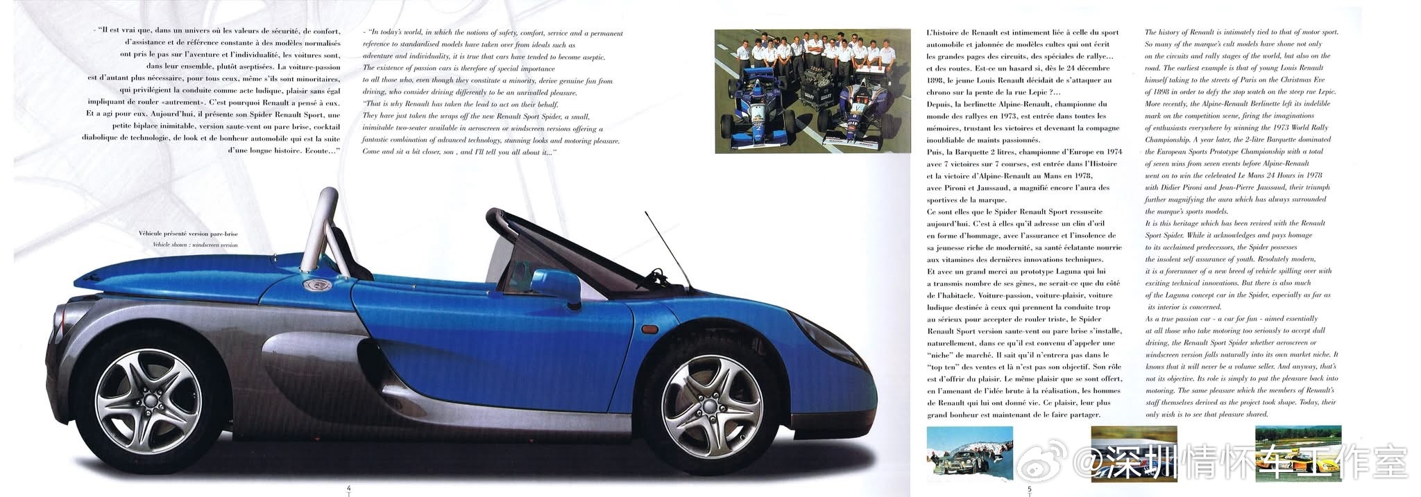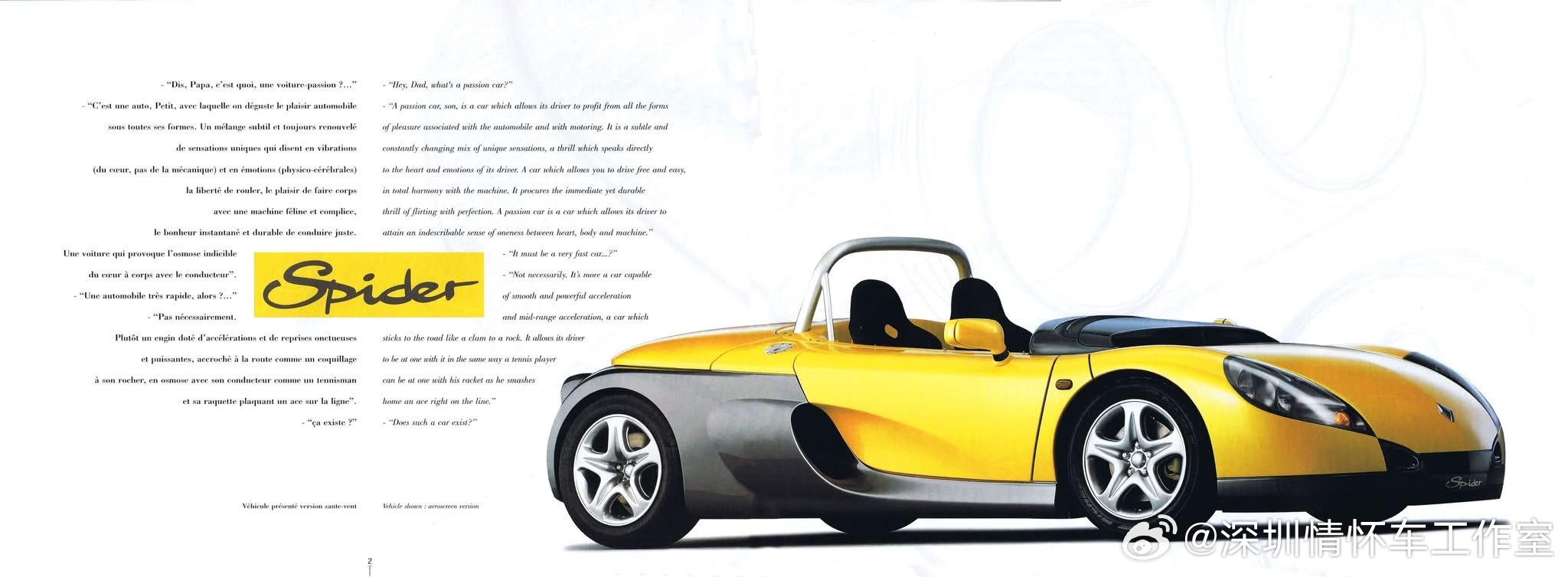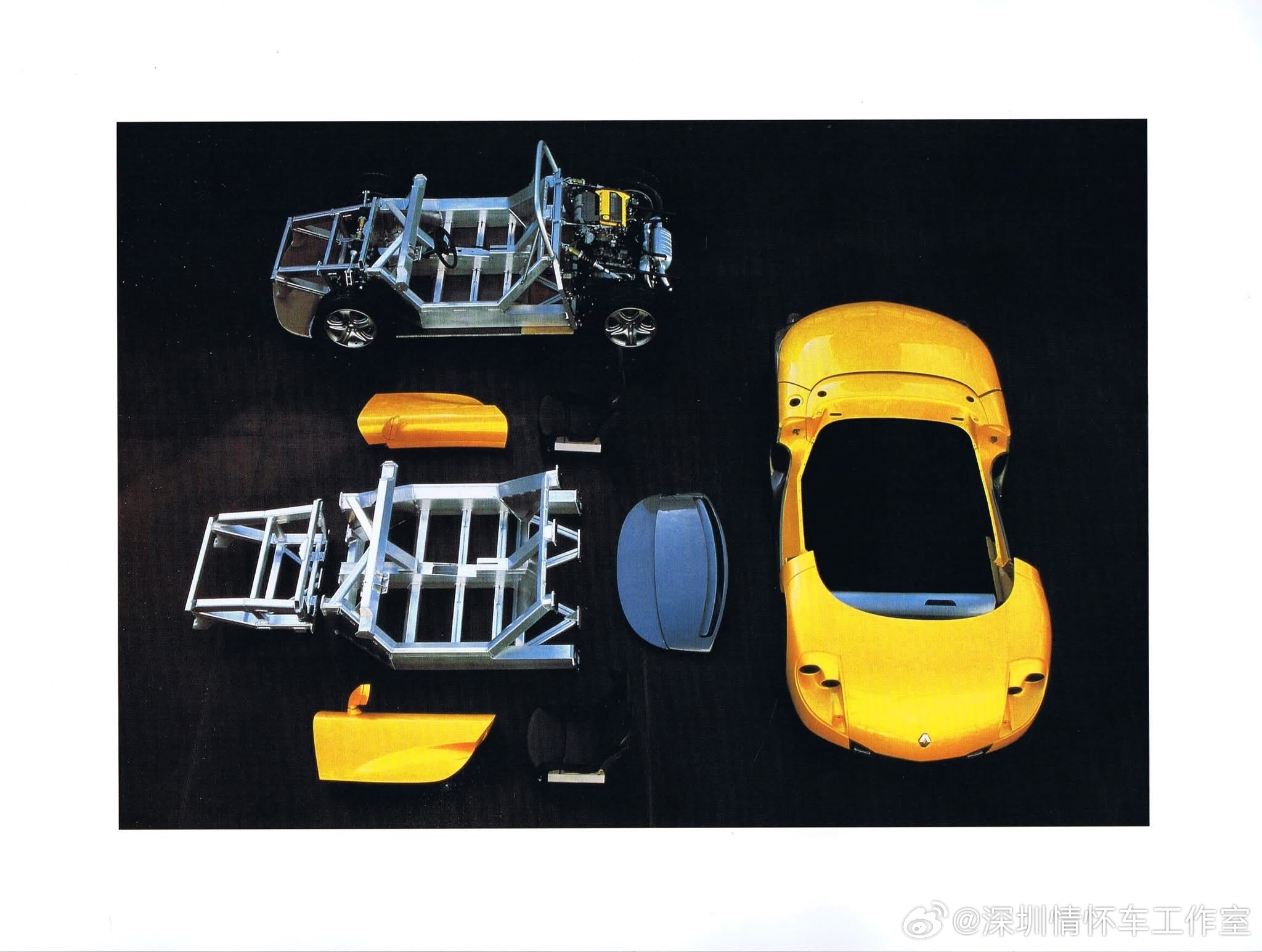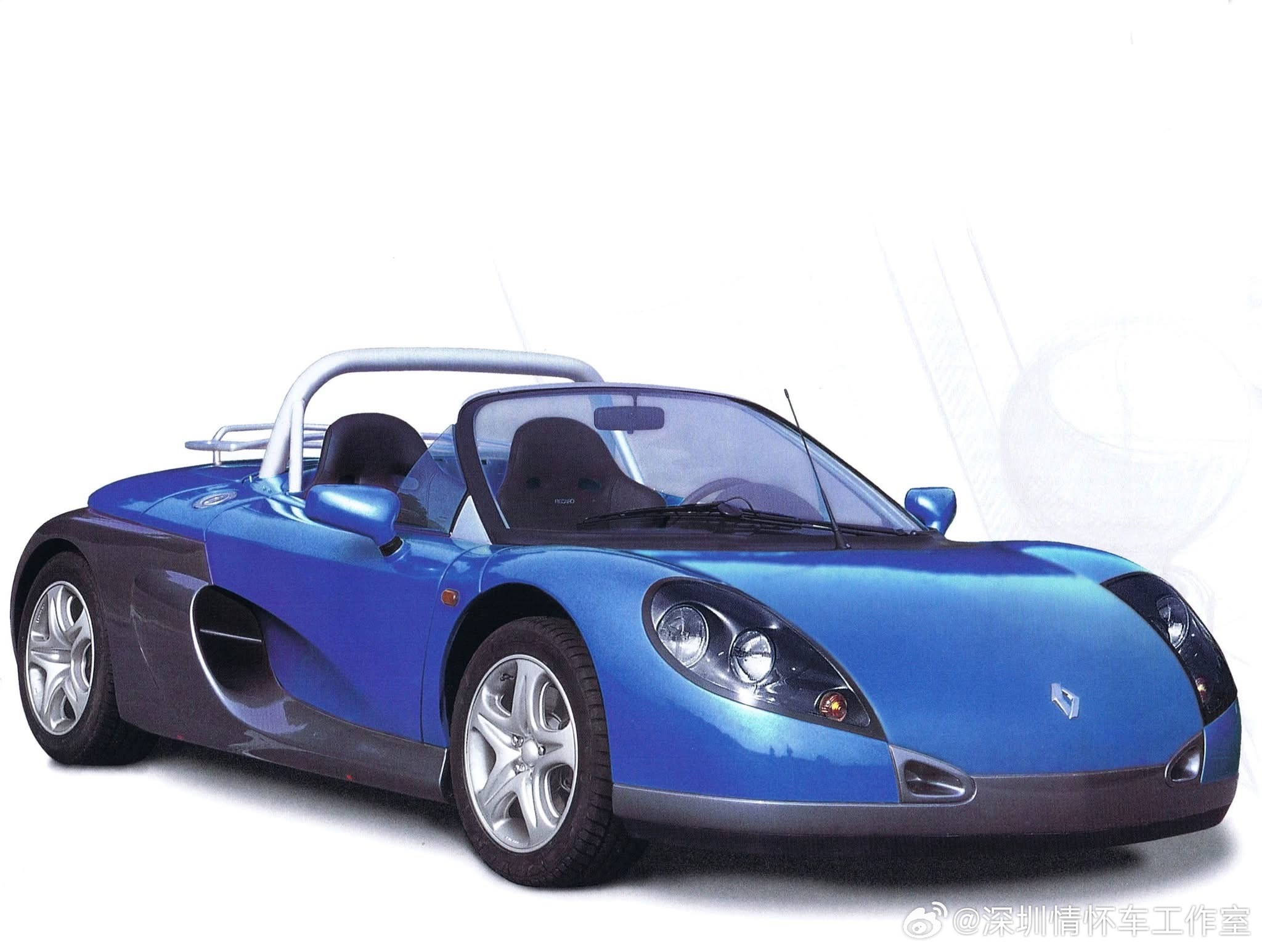 只产了1726辆的雷诺,雷诺Spider,1995年日内瓦车展首发、1996—1999年在法国Dieppe的Alpine工厂量产,是首款挂雷诺Sport标的量产车,限量1726台,极具里程碑意义。定位为双座中置后驱剪刀门敞篷跑车;铝管底盘+复合材料车身,轻量化(930kg无完整风挡,965kg带风挡);无助力转向、无ABS、无气囊,极致驾驶取向;搭载F7R 2.0L 16V四缸(与Clio Williams同源),150马力,5速手动,0-100km/h约6.5s,极速210km/h。作为90年代雷诺重塑运动形象的产物,同时服务单品牌杯赛(Spider Trophy)和公路市场;产量稀少(民用+赛道版合计约1726台),成为90年代小众性能车收藏热门;1999年停产,无直系继任车型。雷诺