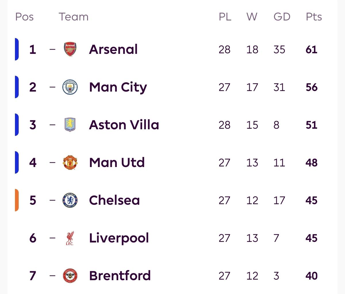 【维拉欧冠资格有点悬了】英超第28轮爆出大冷,狼队在莫利纽克斯球场以2-0的比分,给阿斯顿维拉的欧冠资格争夺希望造成了沉重打击! 算上本场比赛,维拉在二月份的五场英超中仅赢下一场,战绩遭遇滑铁卢。如果本轮曼联能够取胜,他们将直接反超维拉,这会让维拉的排名下滑到第四,陷入更加被动的局面。 而第五的切尔西和第六利物浦虽然目前落后维拉6分,但都少赛一场,这意味着他们随时可能缩小分差。 不过由于英超球队本赛季在欧战的出色极其表现,下个赛季英超大概率仍会有五个欧冠席位,这为维拉在二月份的糟糕表现提供了一定的容错空间。 PS:最新积分榜见图3!阿斯顿维拉