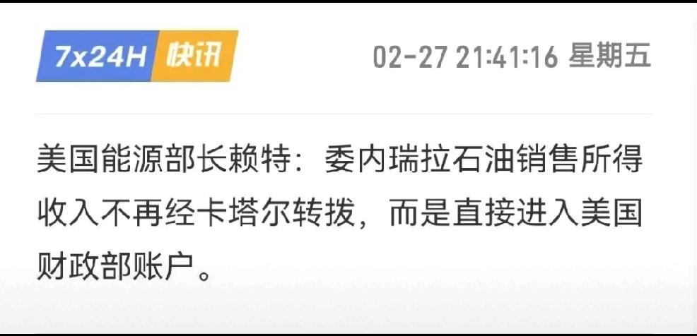 美国能源部长赖特表示:“委内瑞拉石油销售所得收入,不再经卡塔尔账户转拨,而是直接进入美国财政部账户。” 个人认为:符合美国强盗作风,简单粗暴直接抢劫,美国已经把美军武装抢劫,进入公开化,世界化,国家化,产业化,规模化的新时代新时期。 美国在向旧时代旧方法-西装革履的操纵美元,进行金融收割的华尔街式隐秘的技术性的抢劫说再见,有新方法,金融方法不够及时。 个人正在想,美国国内的危机已经到了时不可待,刻不容缓的程度,要不然美国不会这么火烧上房似的美军公开抢劫。 美式霸权在能源领域的公开表现,如此公然违背国际法,如此对国际经贸秩序的践踏,难道美国就不想想未来吗?难道美国就不担忧国际舆论吗?难到美国就不想想这样做的后遗症吗?
