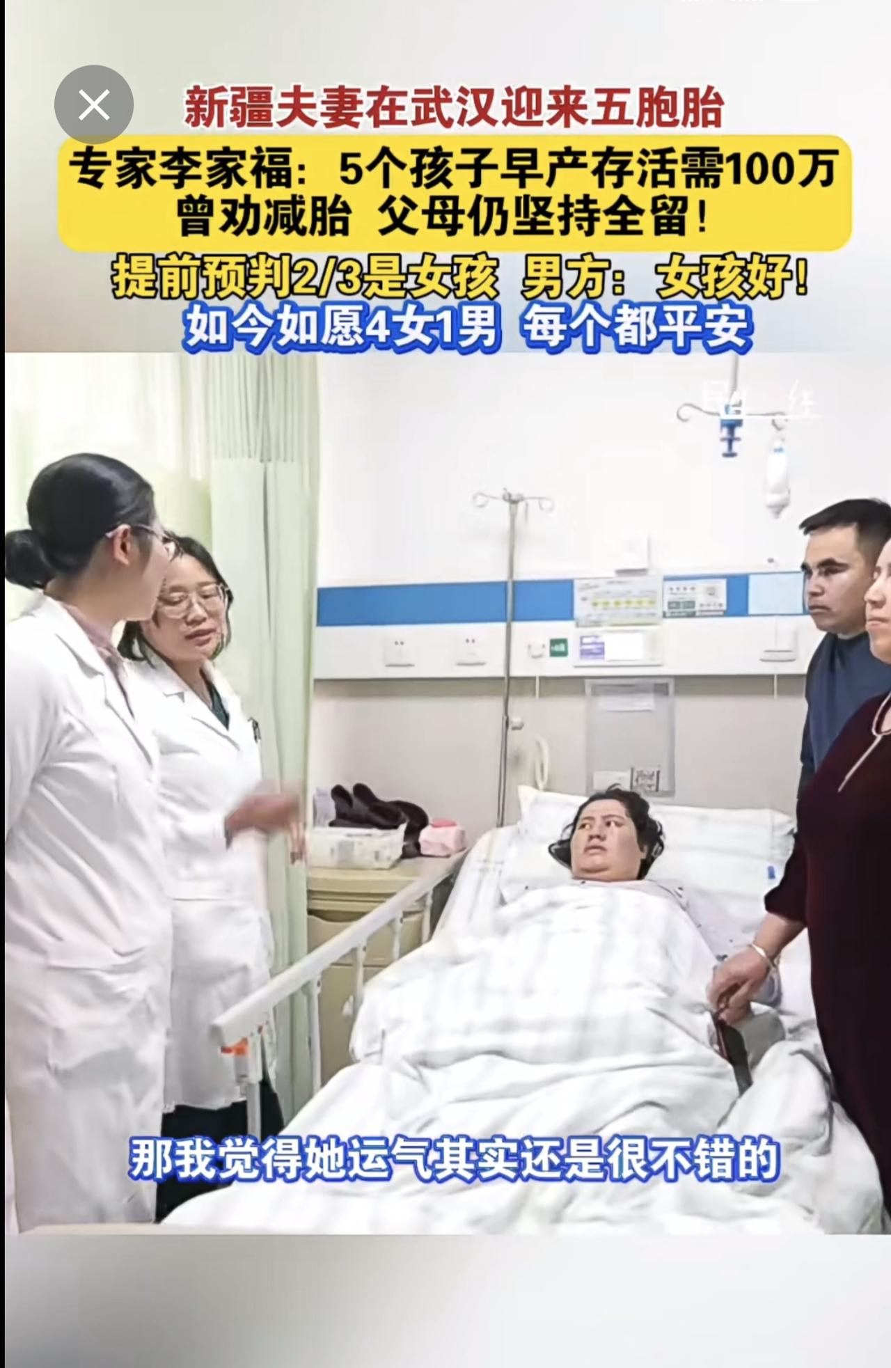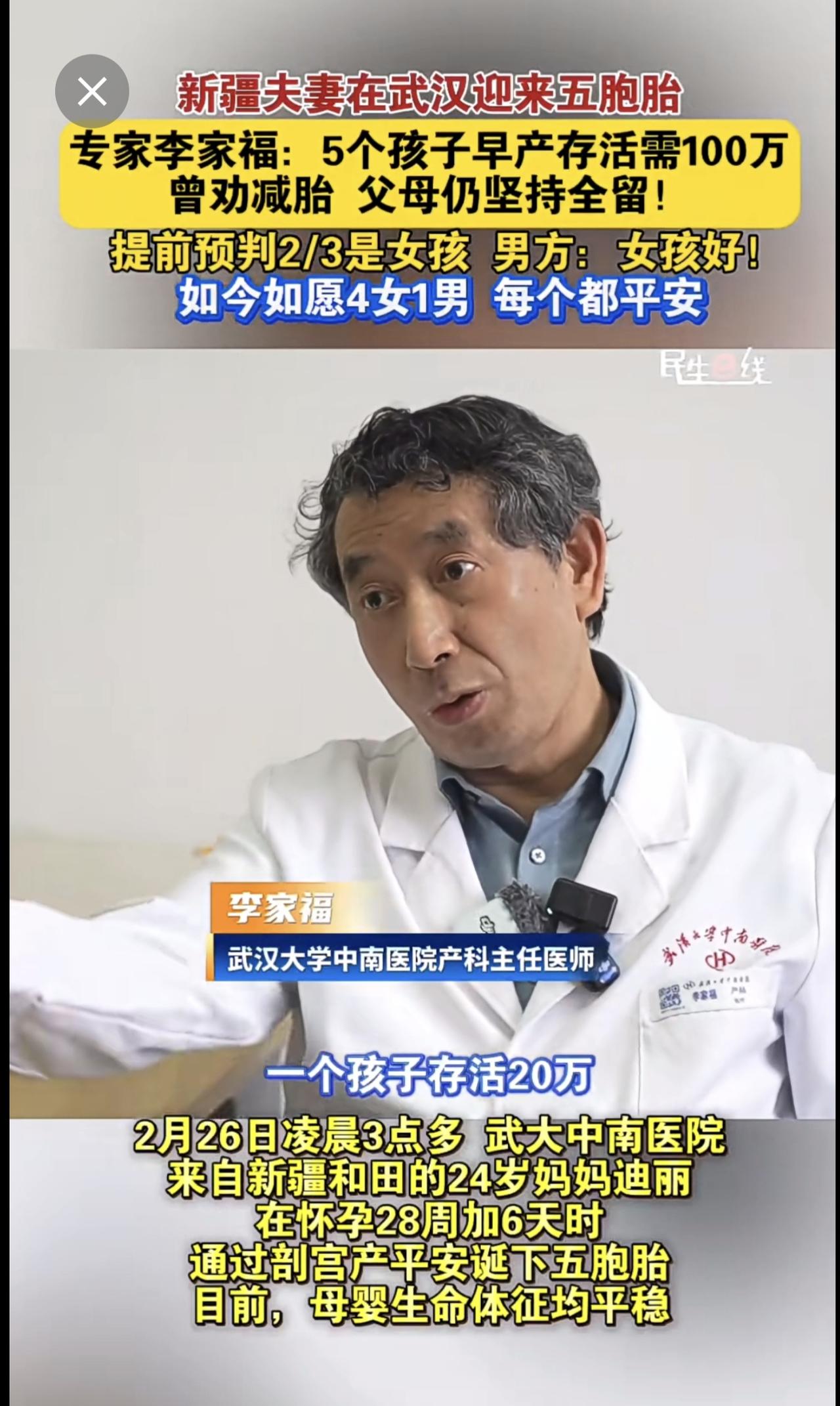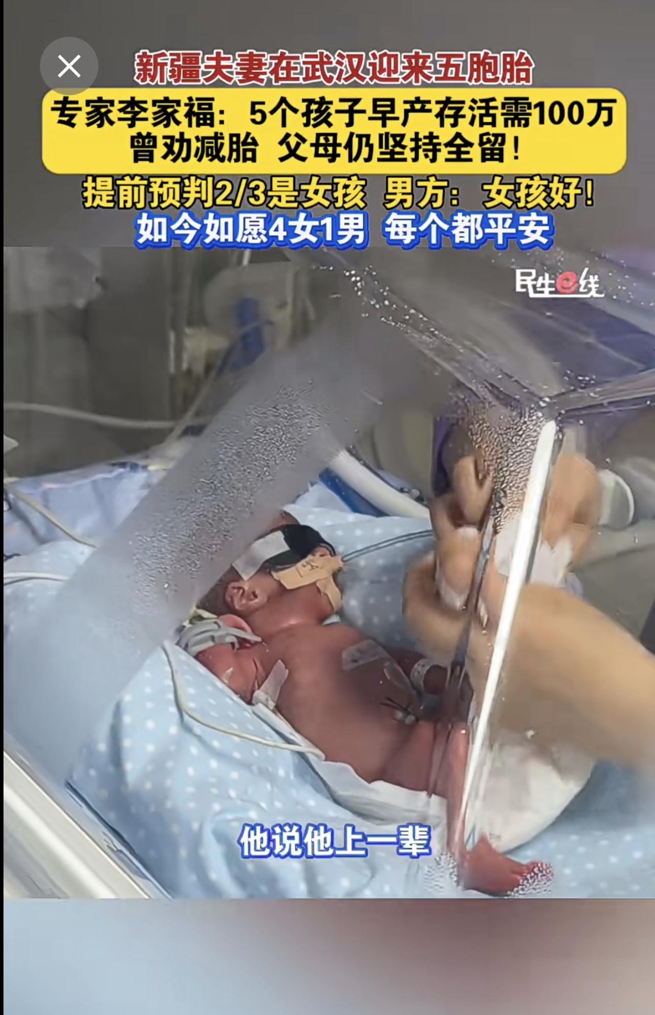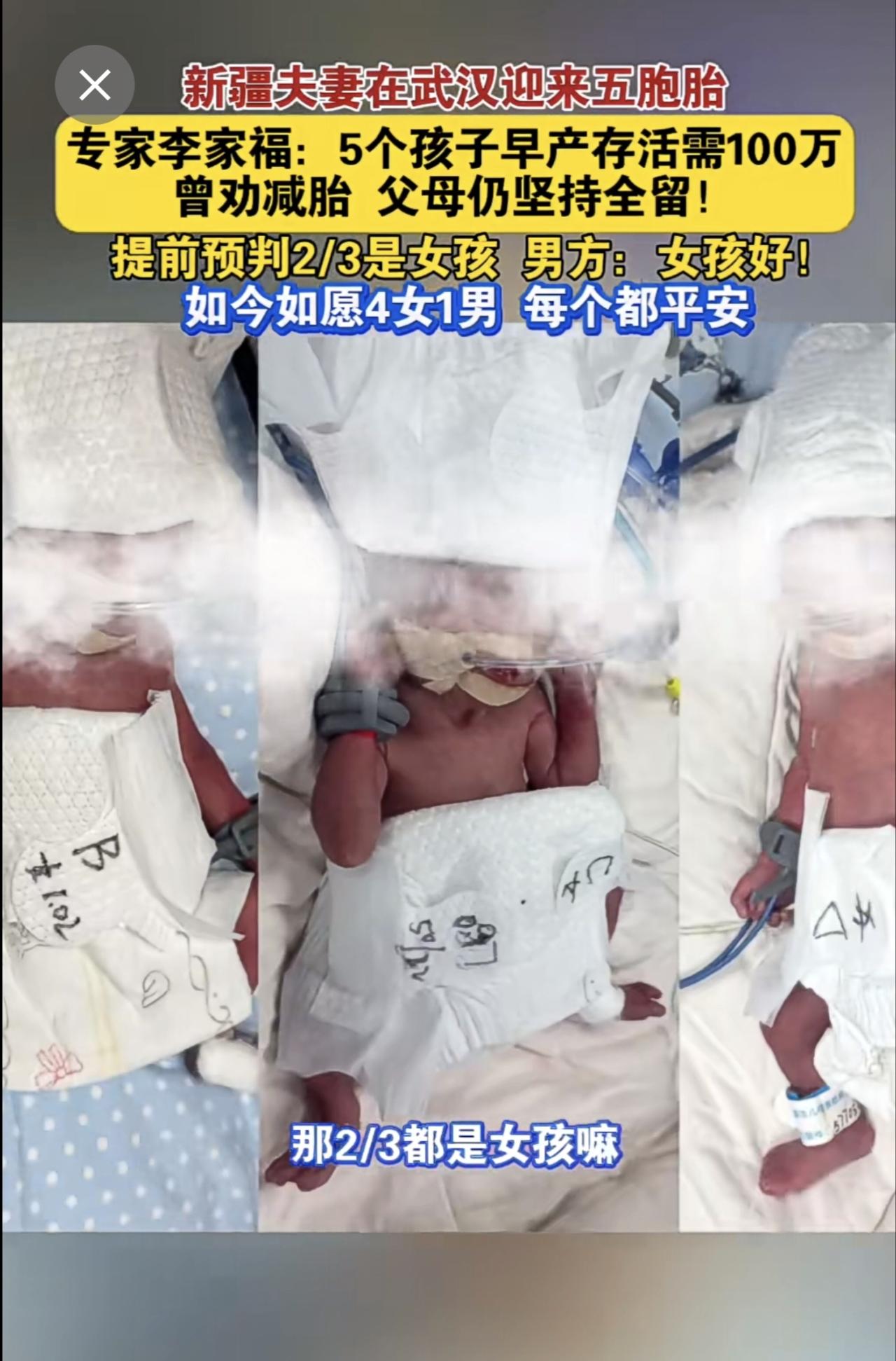 新疆夫妻 在武汉迎来五胞胎 产科专家李家福 :5个孩子早产存活需100万,曾劝减胎,父母仍坚持全留!