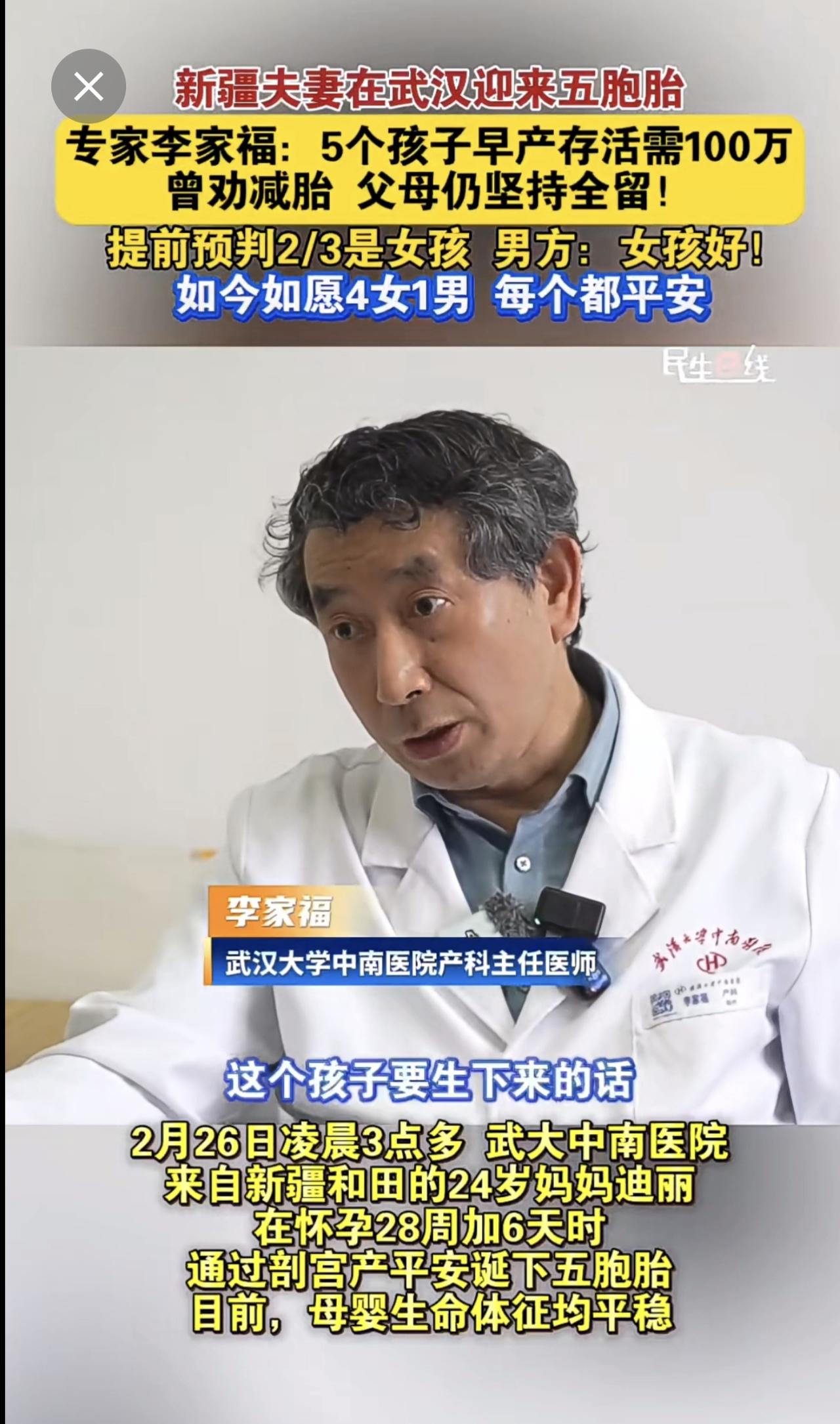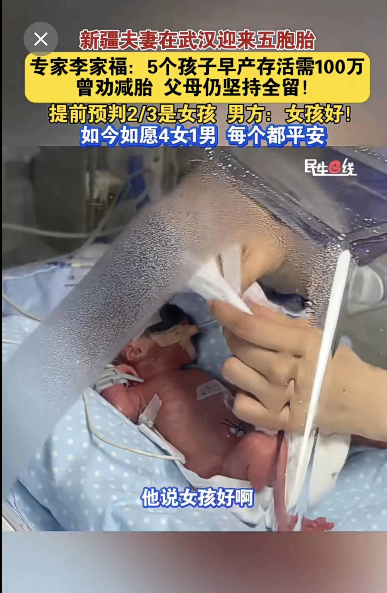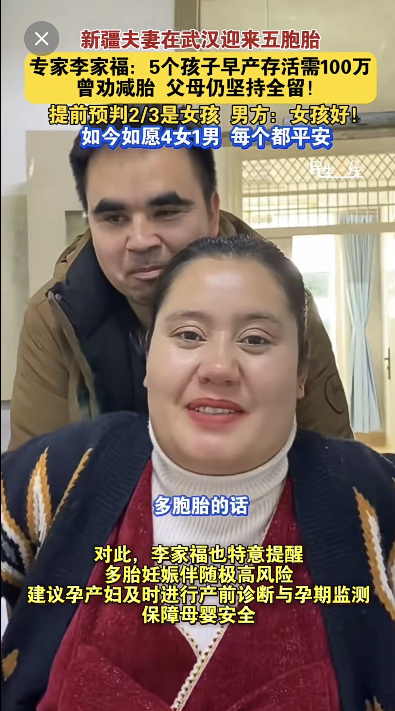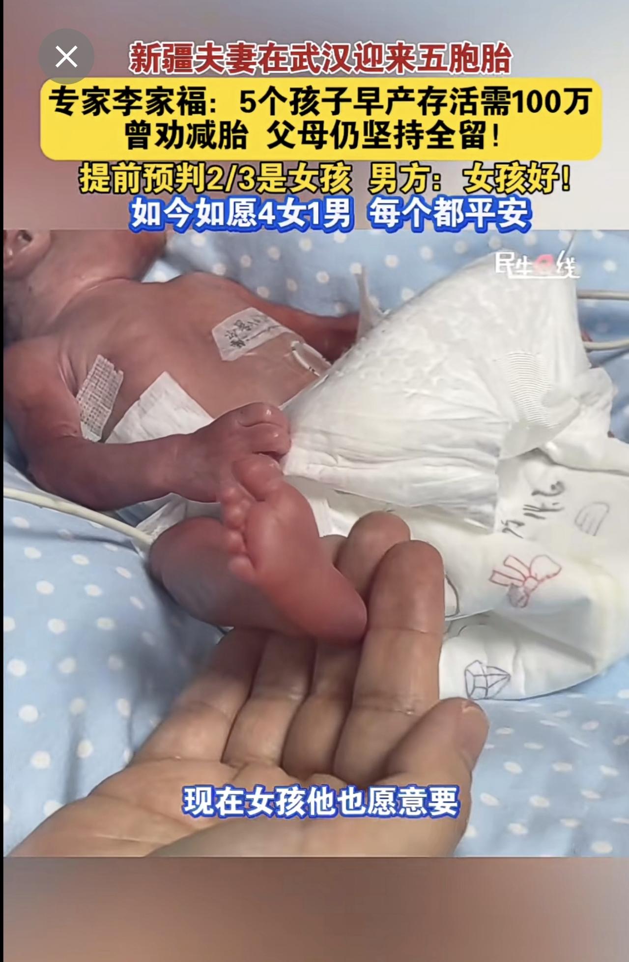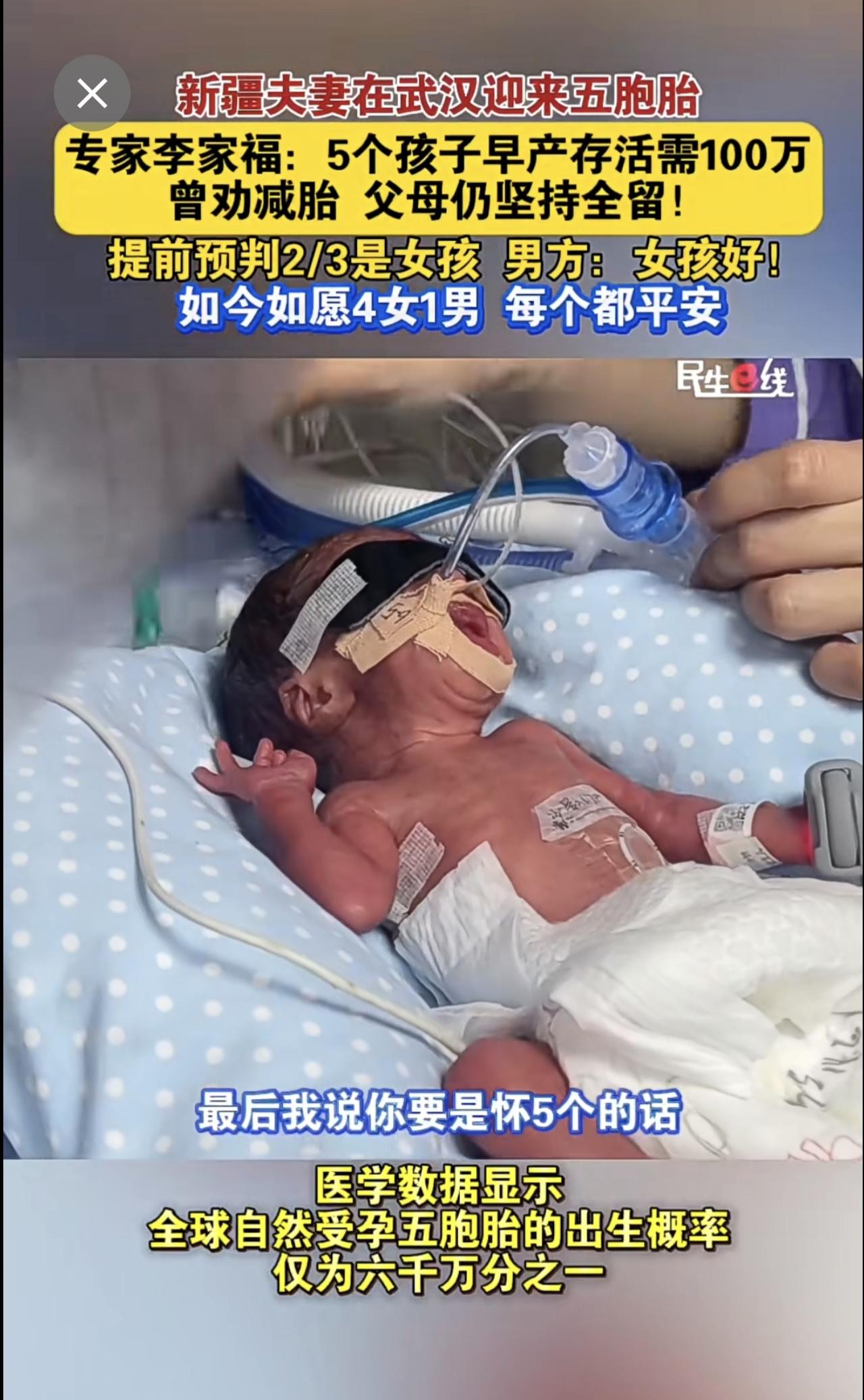 新疆夫妻 在武汉迎来五胞胎 产科专家李家福 :5个孩子早产存活需100万,曾劝减胎,父母仍坚持全留!