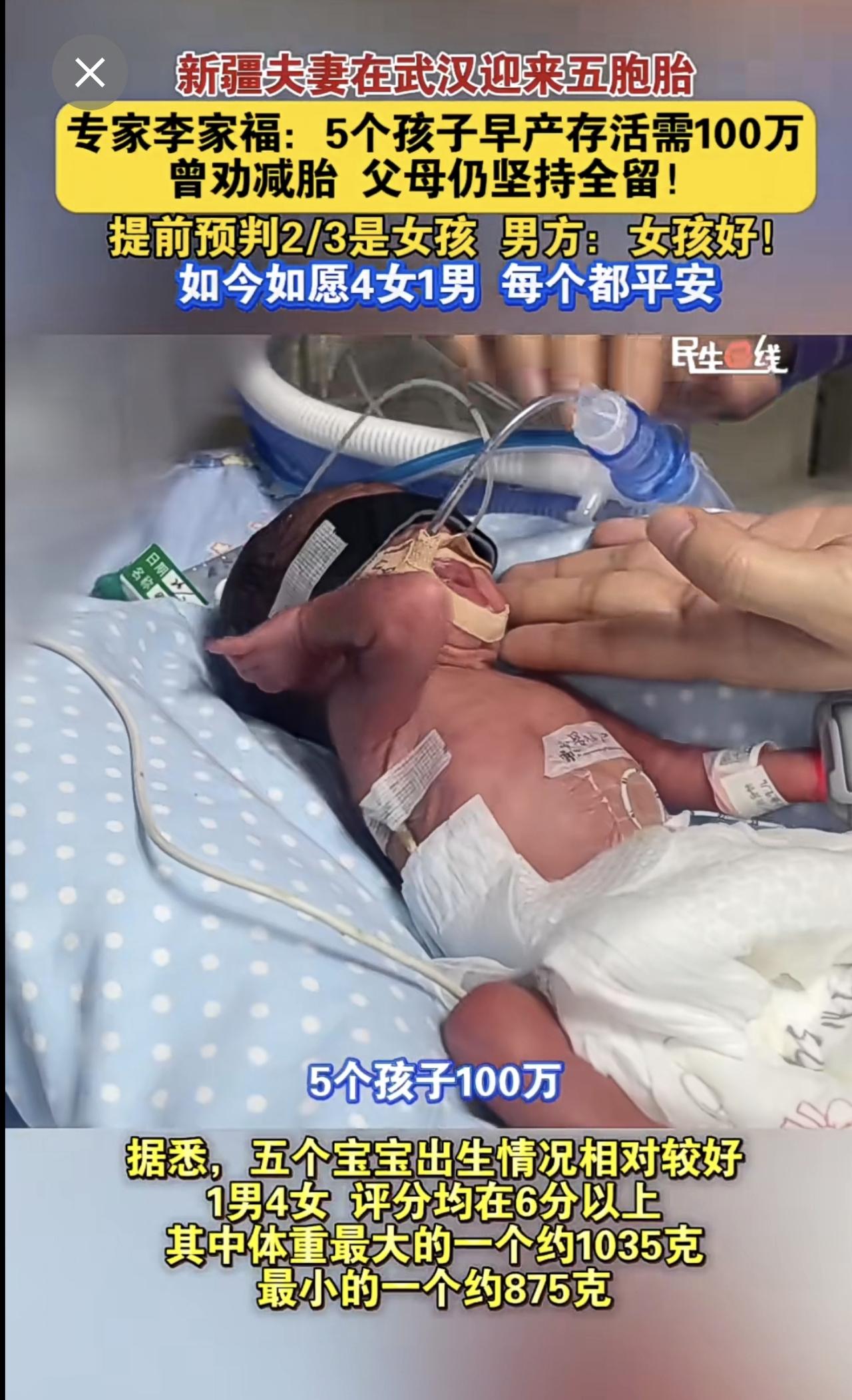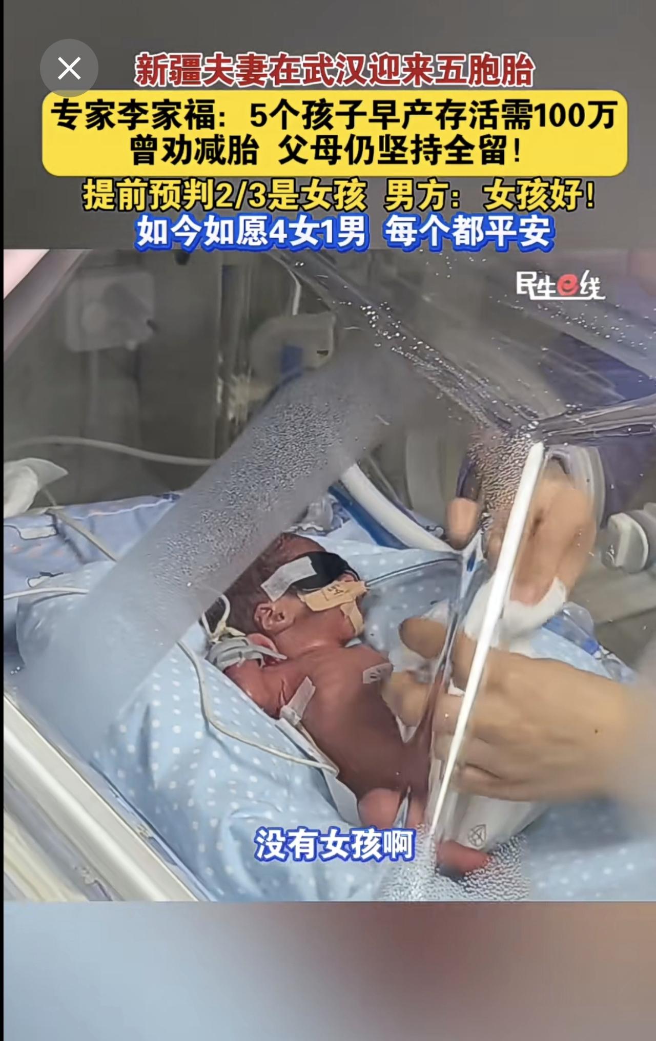 新疆夫妻在武汉迎来五胞胎 产科专家李家福:5个孩子早产存活需100万,曾劝减